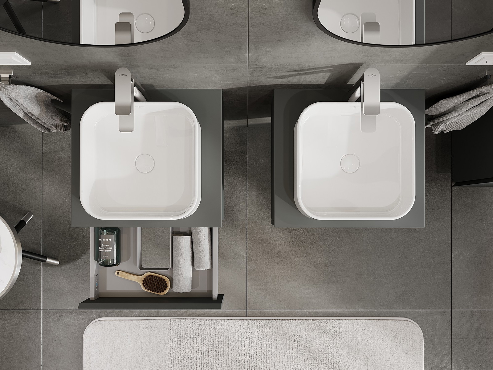 Our modular bathroom furniture can be combined in various colour configurations, allowing for complete personalisation. You can choose both the appearance and functions of individual elements, enabling you to adapt the furniture to your own stylistic and functional preferences.