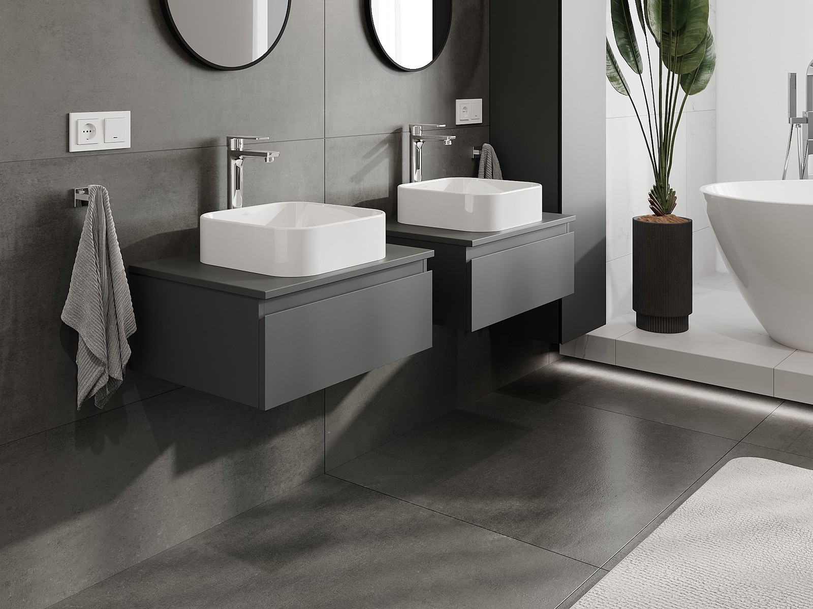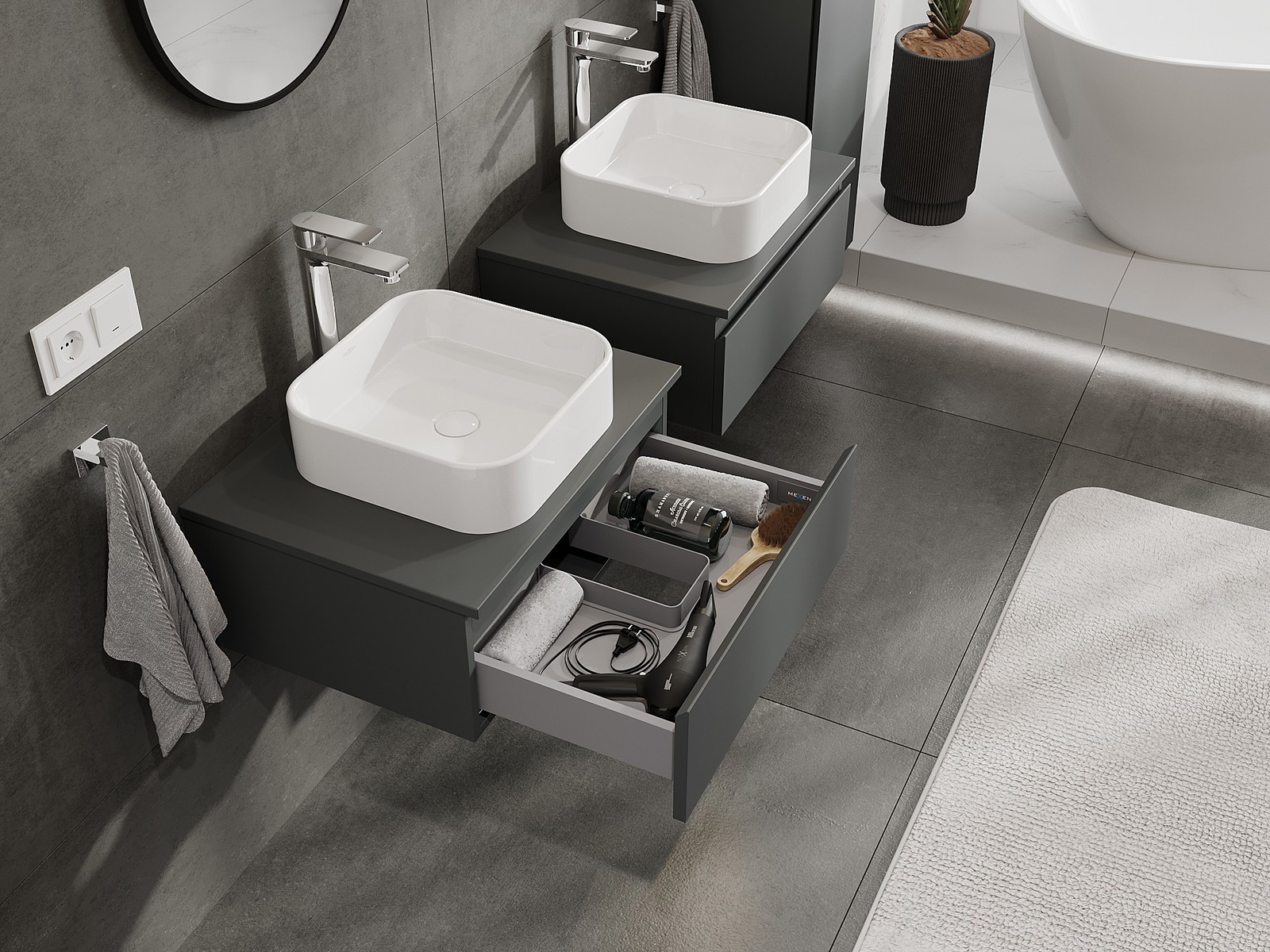 Our modular bathroom furniture can be combined in various colour configurations, allowing for complete personalisation. You can choose both the appearance and functions of individual elements, enabling you to adapt the furniture to your own stylistic and functional preferences.