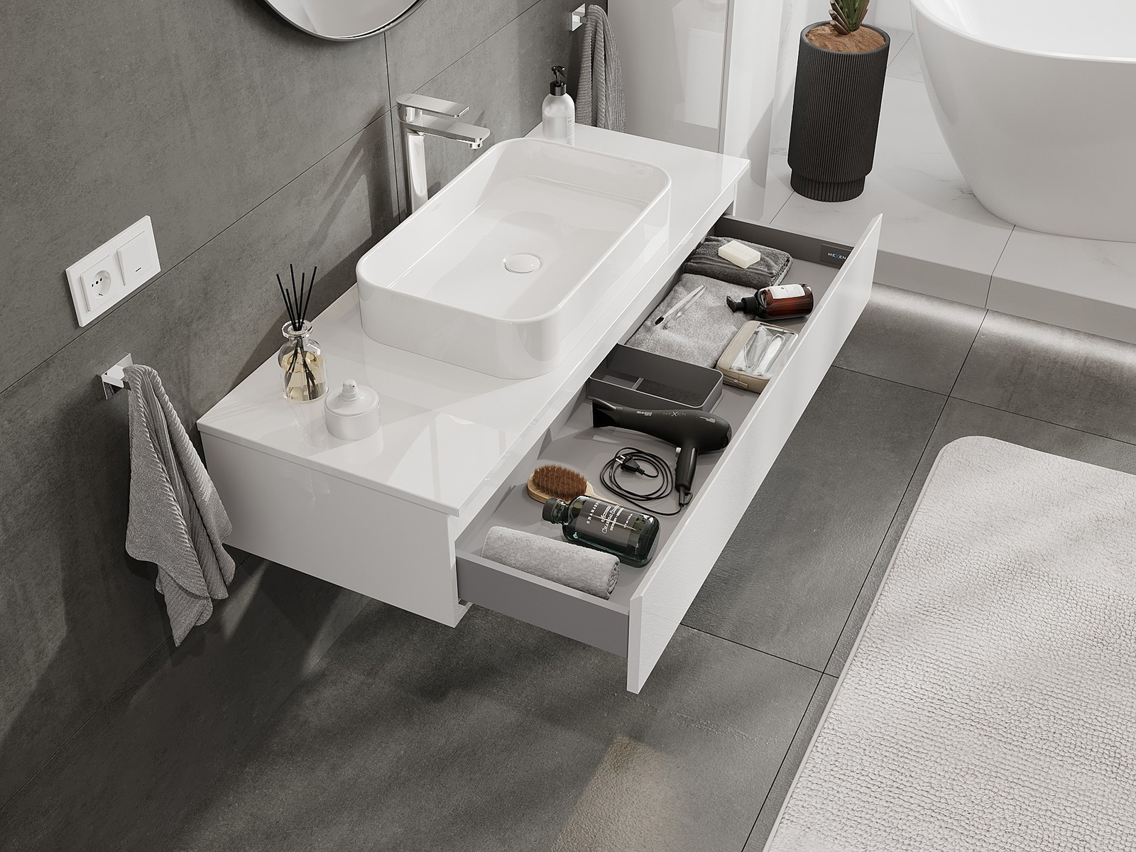 Our modular bathroom furniture can be combined in various colour configurations, allowing for complete personalisation. You can choose both the appearance and functions of individual elements, enabling you to adapt the furniture to your own stylistic and functional preferences.