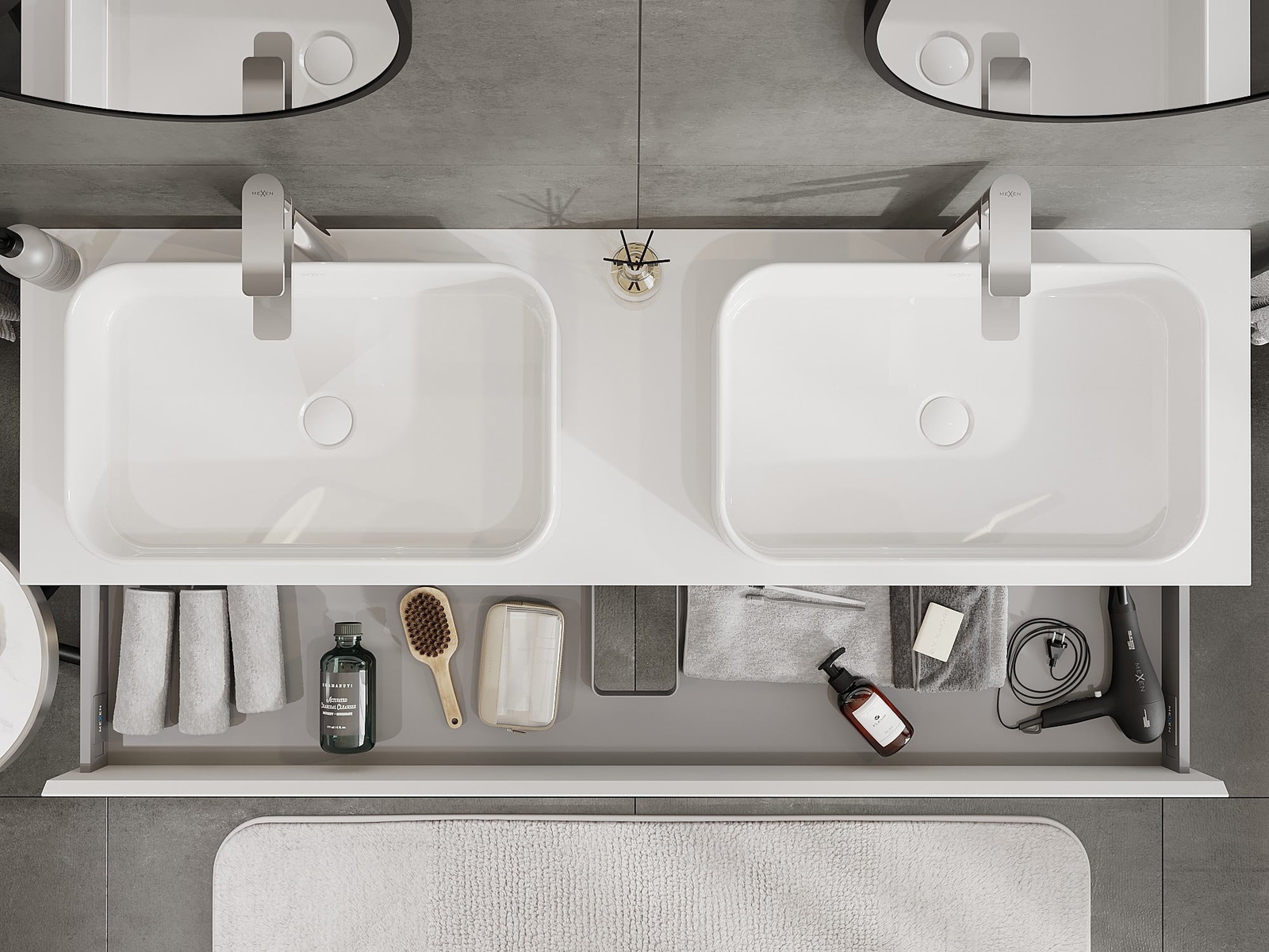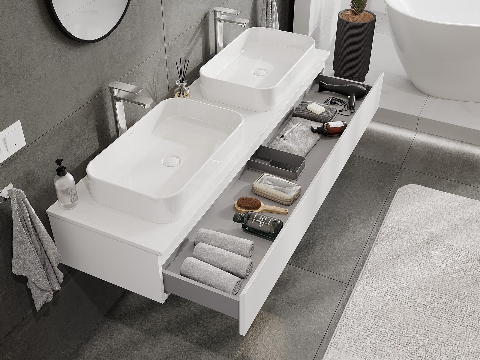 Our modular bathroom furniture can be combined in various colour configurations, allowing for complete personalisation. You can choose both the appearance and functions of individual elements, enabling you to adapt the furniture to your own stylistic and functional preferences.