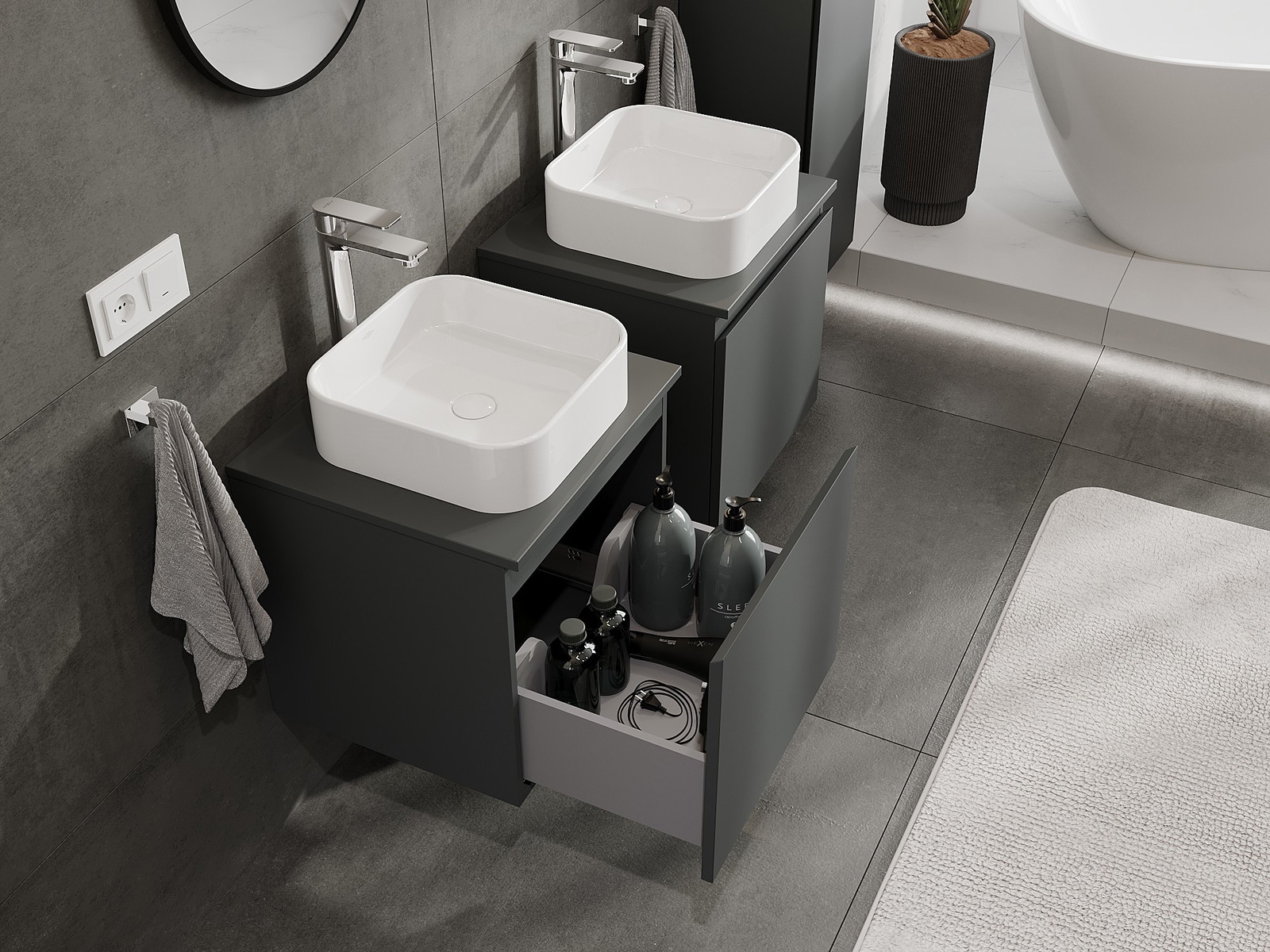 Our modular bathroom furniture can be combined in various colour configurations, allowing for complete personalisation. You can choose both the appearance and functions of individual elements, enabling you to adapt the furniture to your own stylistic and functional preferences.