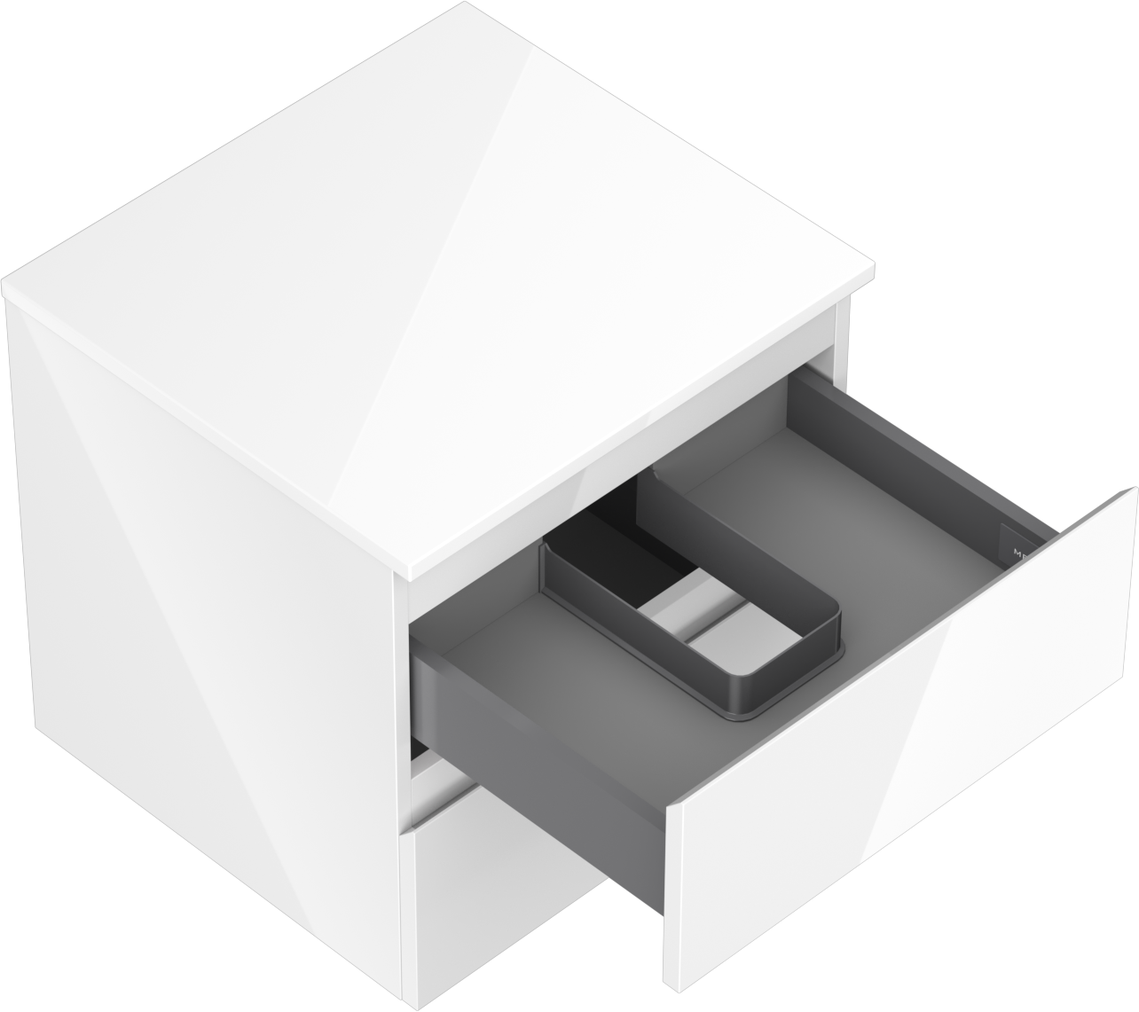 The cutout in the drawer is designed in such a way as to accommodate the siphon, which is essential in sink installations. This allows the furniture to be fully functional without having to give up drawer space for the installation.