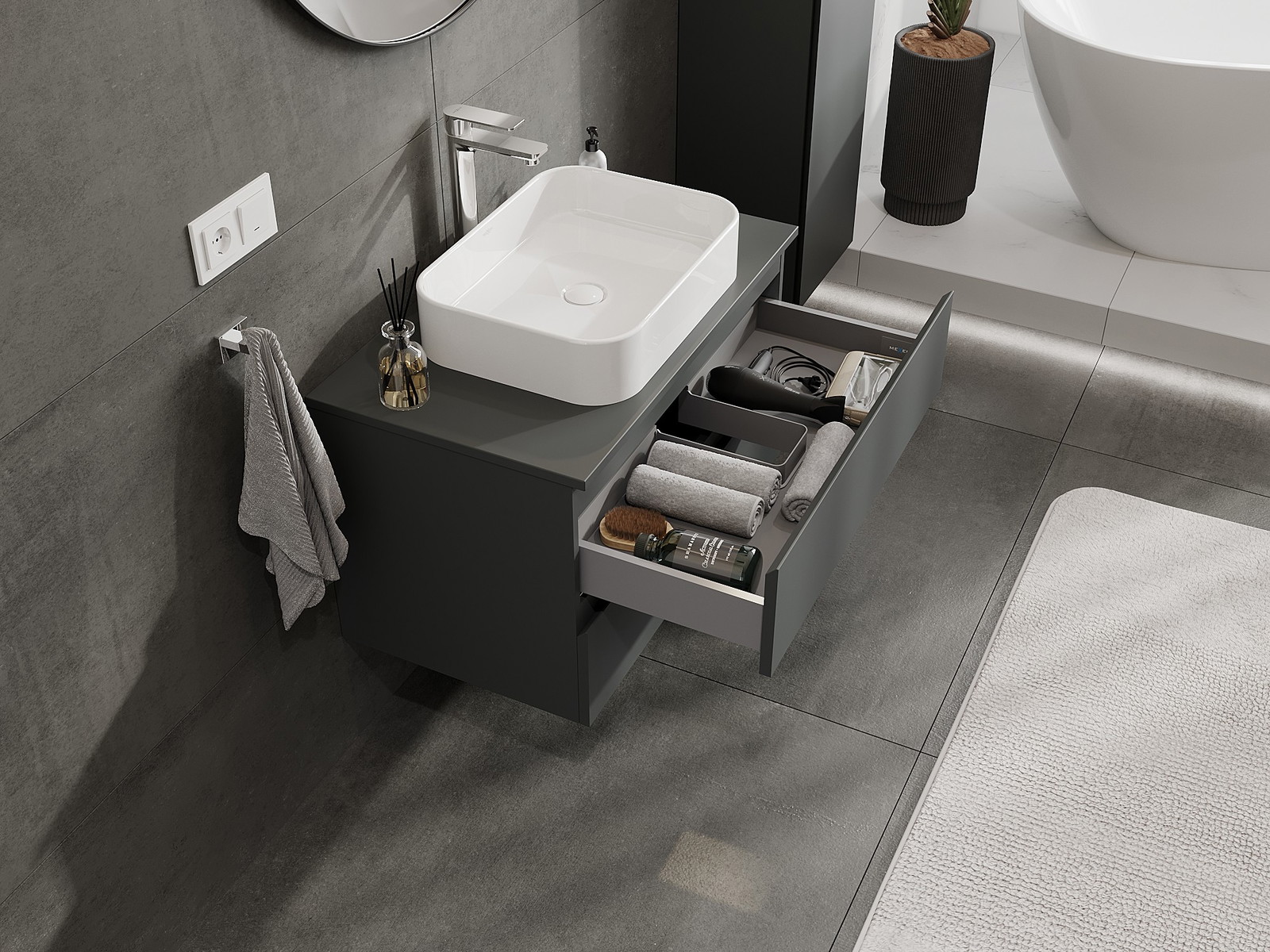 Our modular bathroom furniture can be combined in various colour configurations, allowing for complete personalisation. You can choose both the appearance and functions of individual elements, enabling you to adapt the furniture to your own stylistic and functional preferences.