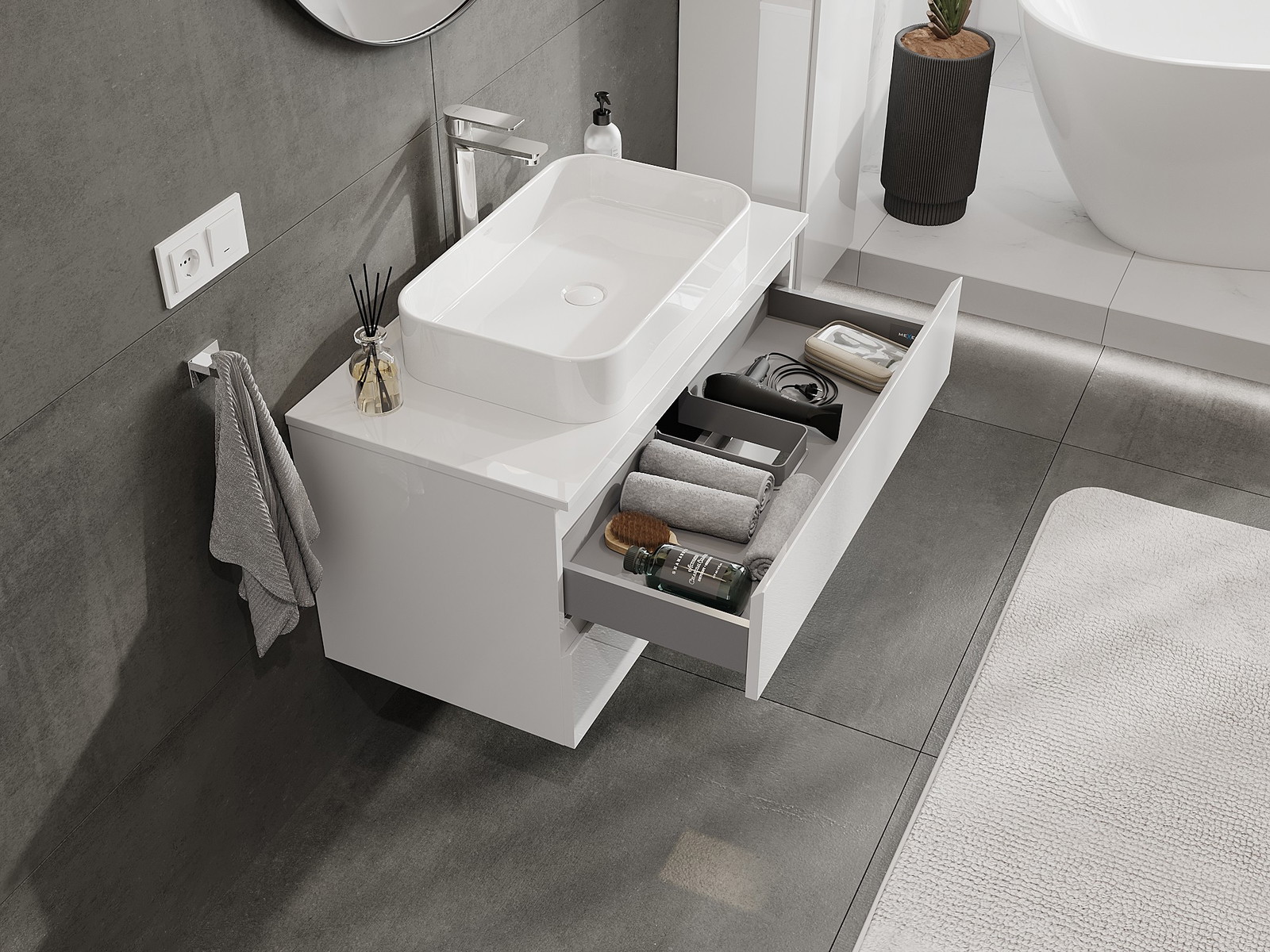 Our modular bathroom furniture can be combined in various colour configurations, allowing for complete personalisation. You can choose both the appearance and functions of individual elements, enabling you to adapt the furniture to your own stylistic and functional preferences.