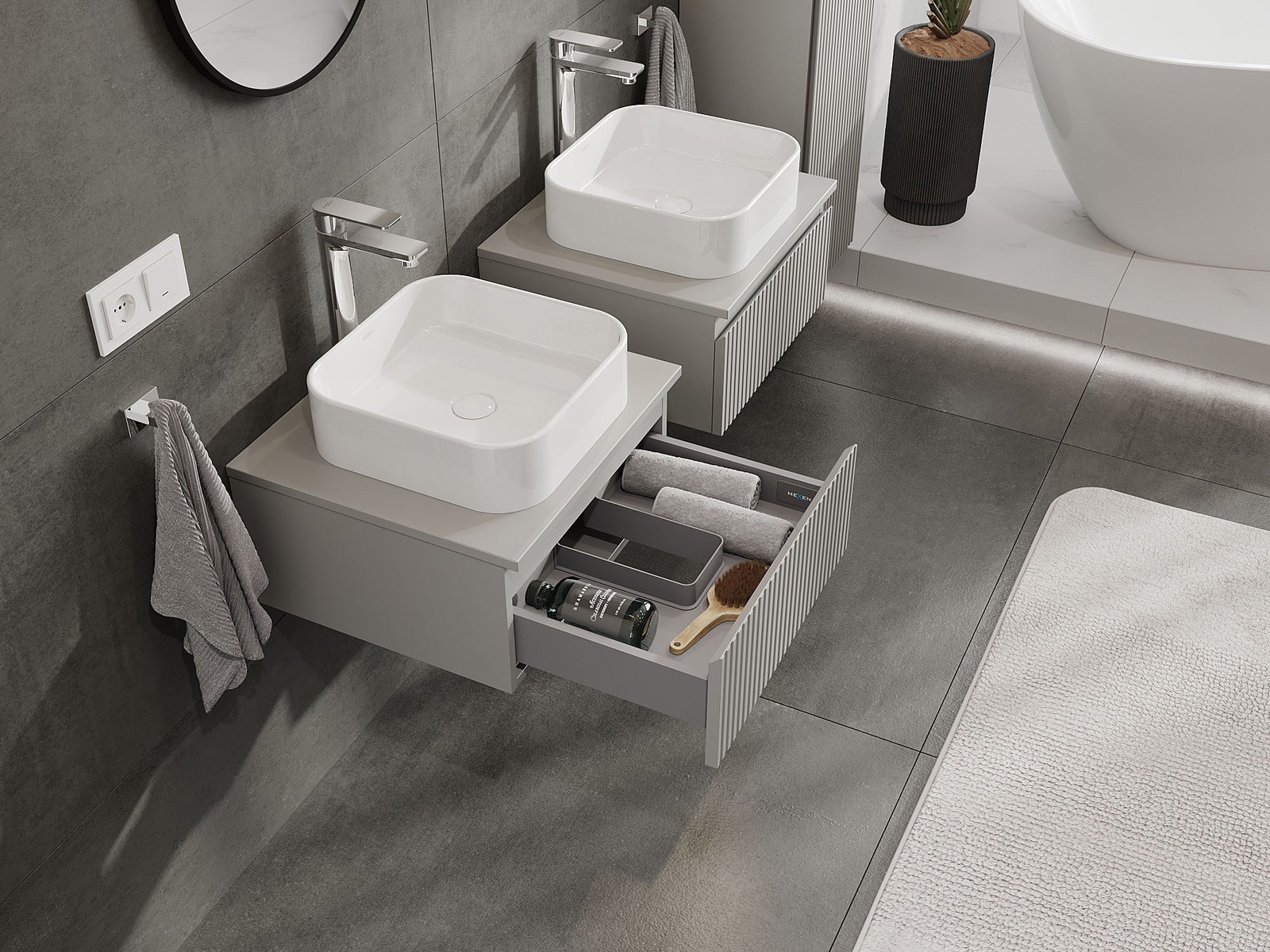 Our modular bathroom furniture can be combined in various colour configurations, allowing for complete personalisation. You can choose both the appearance and functions of individual elements, enabling you to adapt the furniture to your own stylistic and functional preferences.
