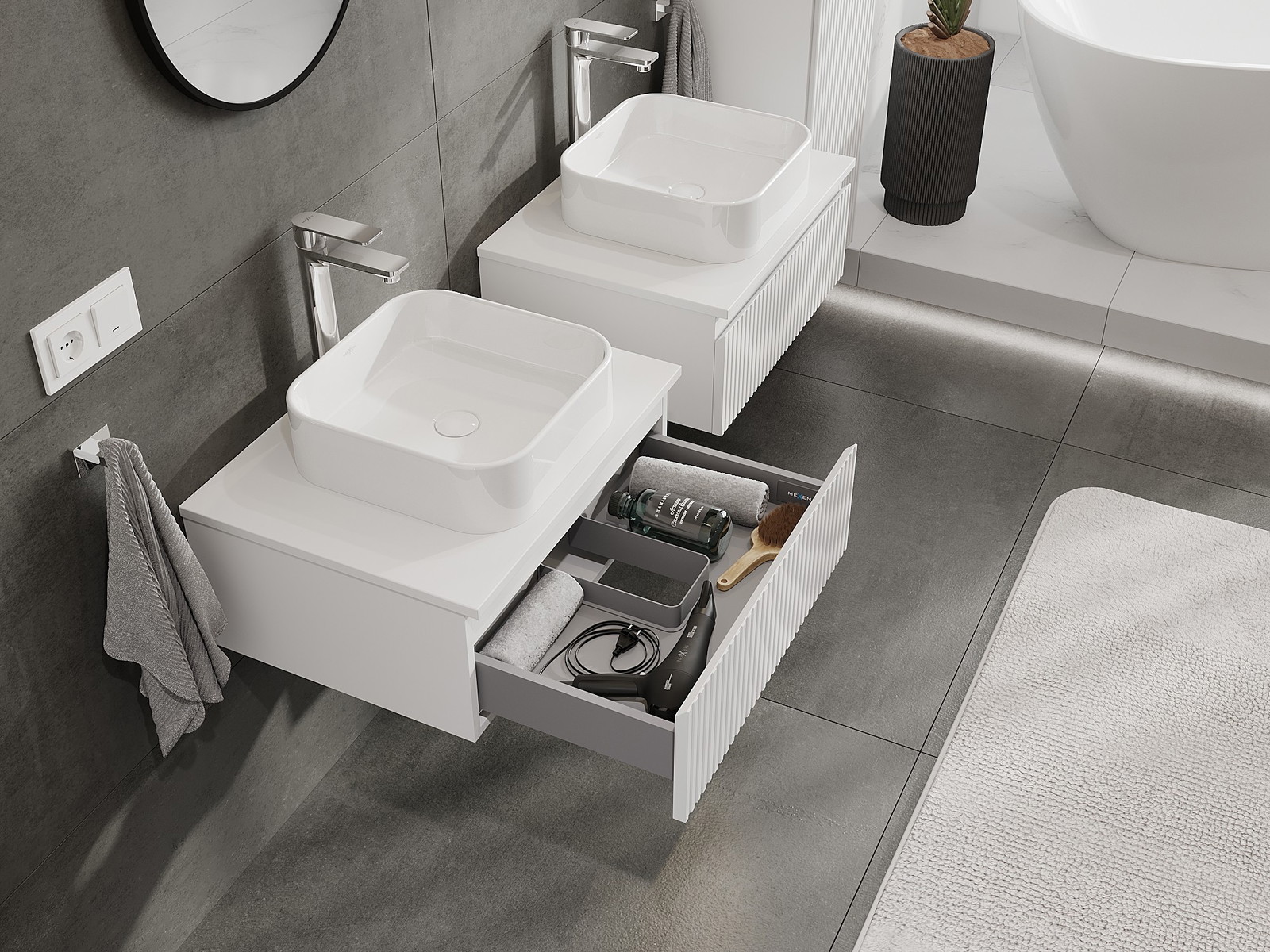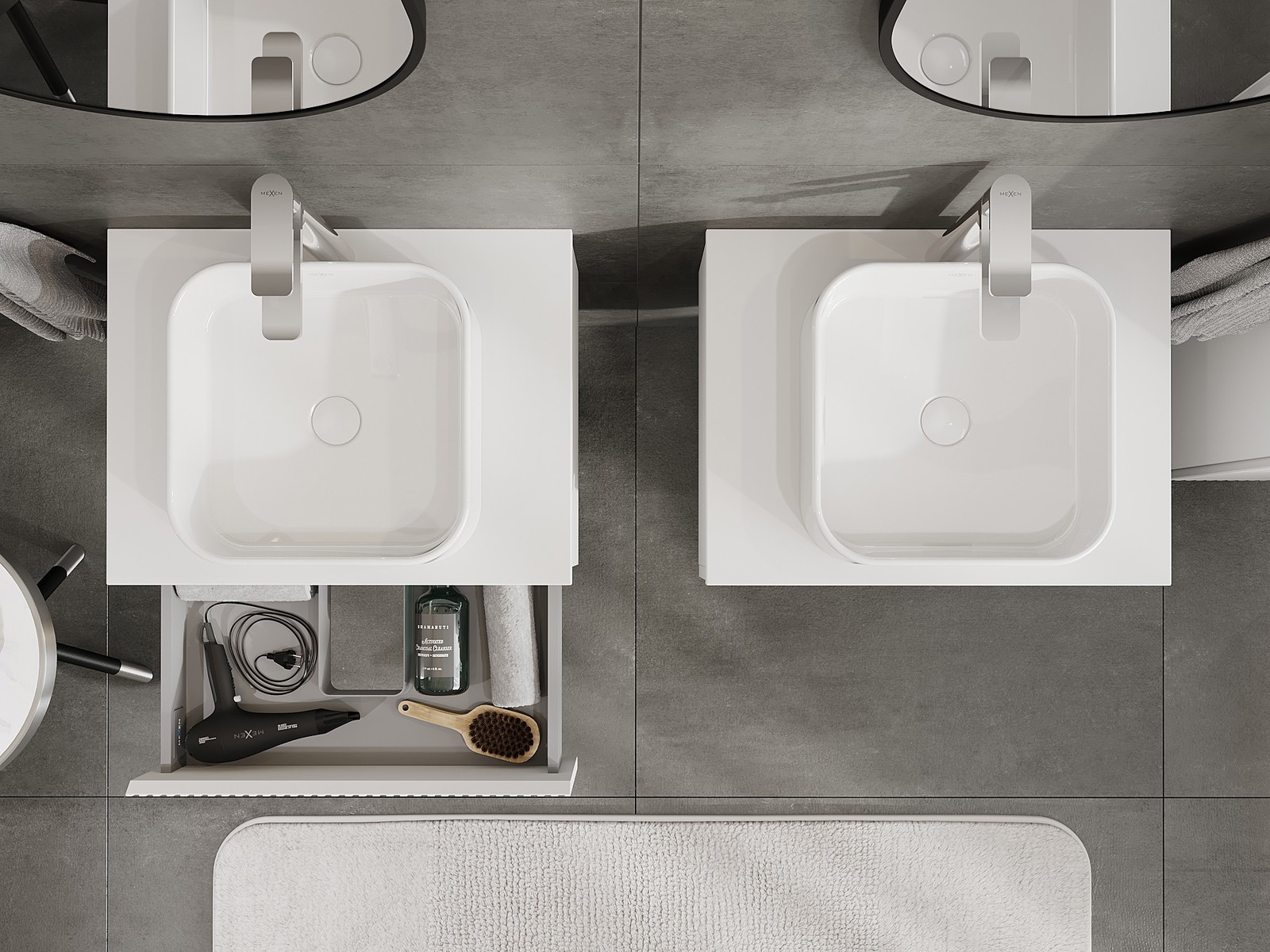 Our modular bathroom furniture can be combined in various colour configurations, allowing for complete personalisation. You can choose both the appearance and functions of individual elements, enabling you to adapt the furniture to your own stylistic and functional preferences.