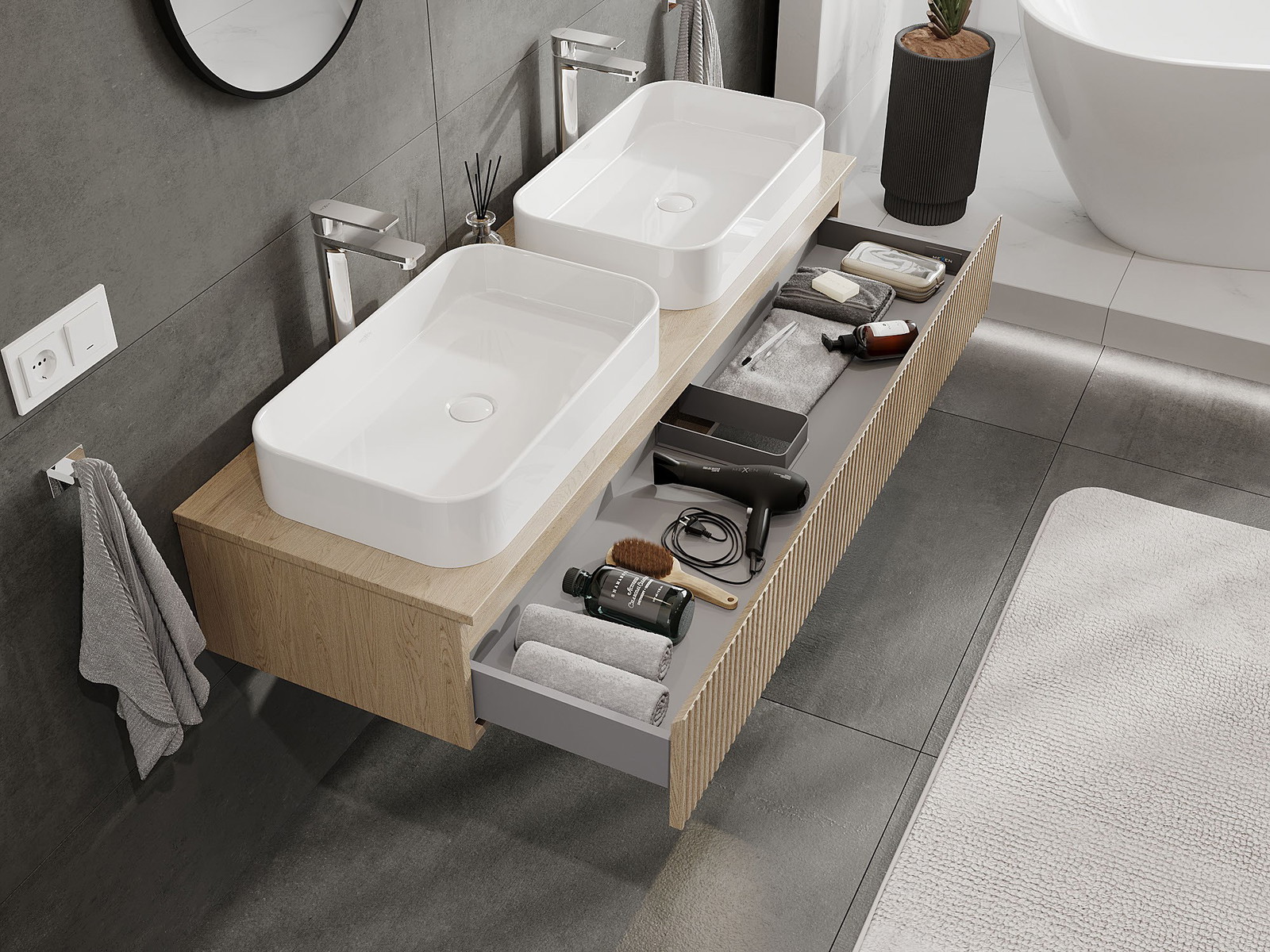 Our modular bathroom furniture can be combined in various colour configurations, allowing for complete personalisation. You can choose both the appearance and functions of individual elements, enabling you to adapt the furniture to your own stylistic and functional preferences.