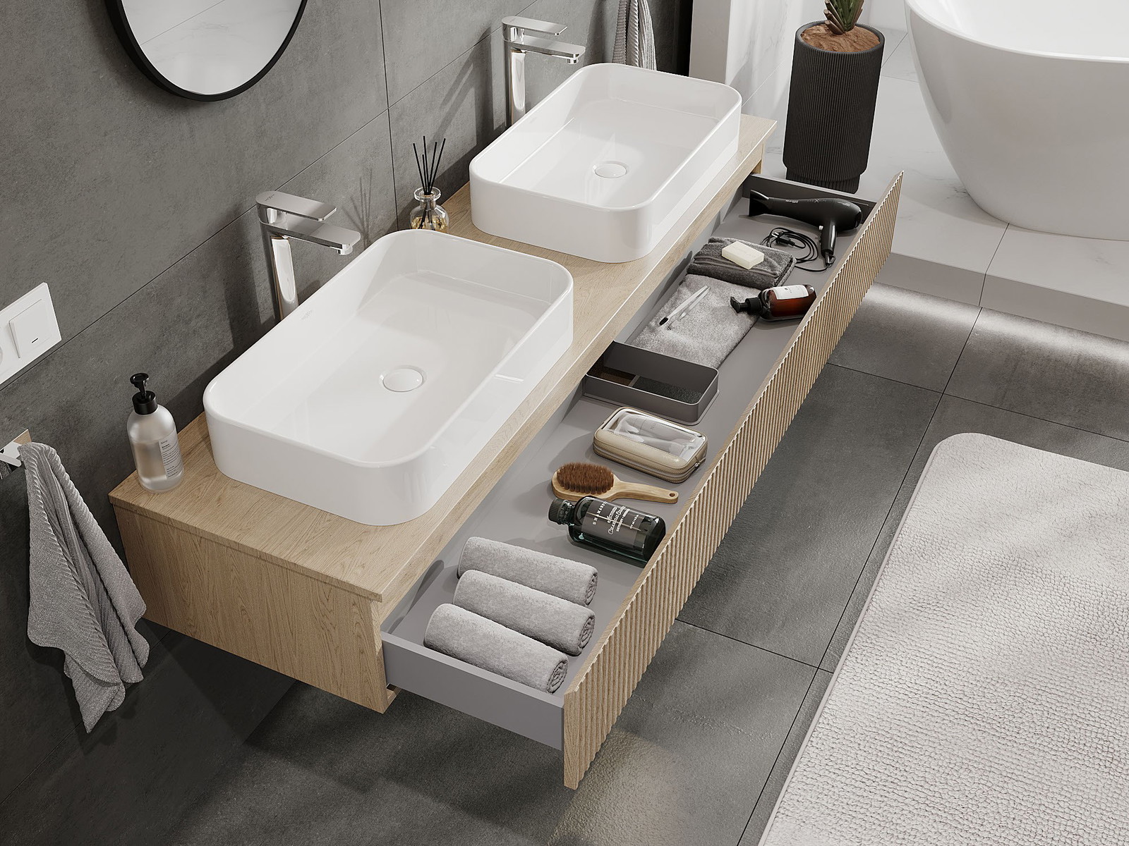 Our modular bathroom furniture can be combined in various colour configurations, allowing for complete personalisation. You can choose both the appearance and functions of individual elements, enabling you to adapt the furniture to your own stylistic and functional preferences.