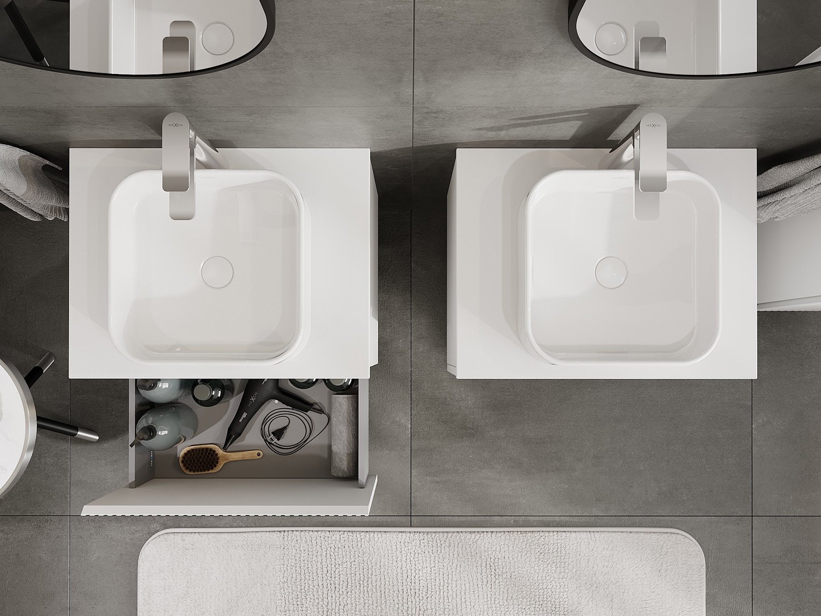 Our modular bathroom furniture can be combined in various colour configurations, allowing for complete personalisation. You can choose both the appearance and functions of individual elements, enabling you to adapt the furniture to your own stylistic and functional preferences.