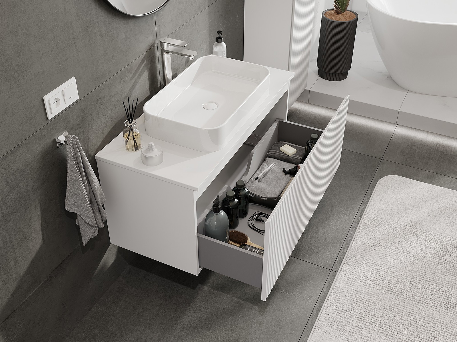 Our modular bathroom furniture can be combined in various colour configurations, allowing for complete personalisation. You can choose both the appearance and functions of individual elements, enabling you to adapt the furniture to your own stylistic and functional preferences.