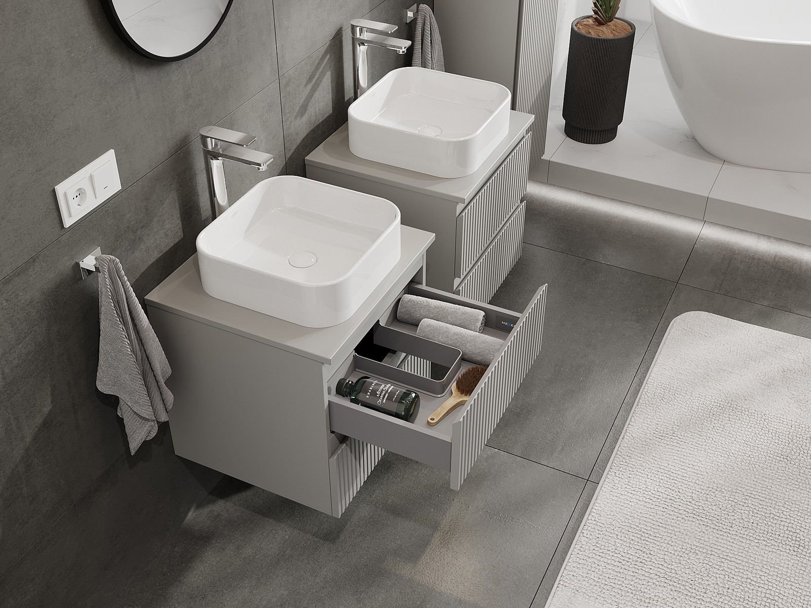 Our modular bathroom furniture can be combined in various colour configurations, allowing for complete personalisation. You can choose both the appearance and functions of individual elements, enabling you to adapt the furniture to your own stylistic and functional preferences.