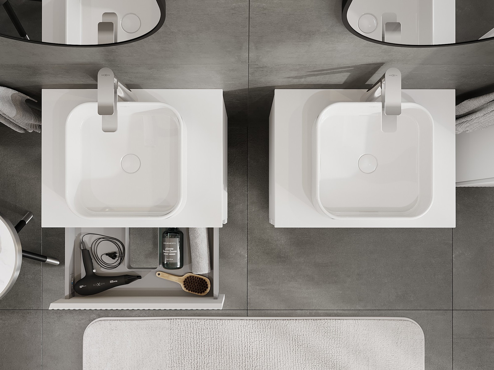 Our modular bathroom furniture can be combined in various colour configurations, allowing for complete personalisation. You can choose both the appearance and functions of individual elements, enabling you to adapt the furniture to your own stylistic and functional preferences.