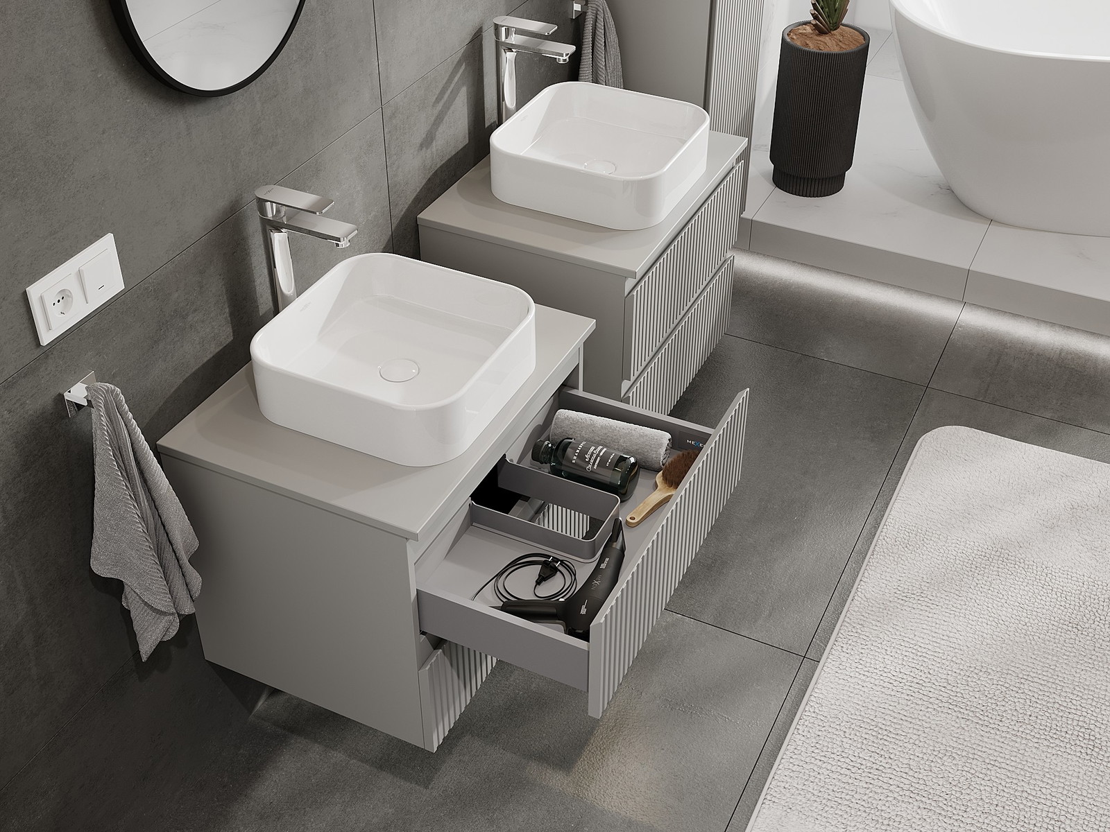 Our modular bathroom furniture can be combined in various colour configurations, allowing for complete personalisation. You can choose both the appearance and functions of individual elements, enabling you to adapt the furniture to your own stylistic and functional preferences.