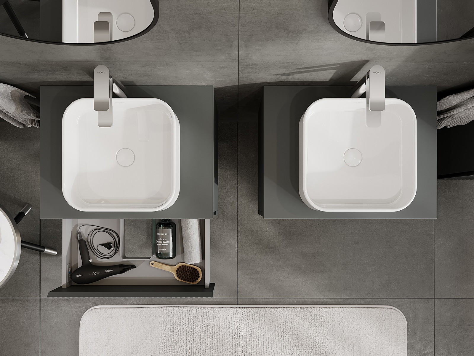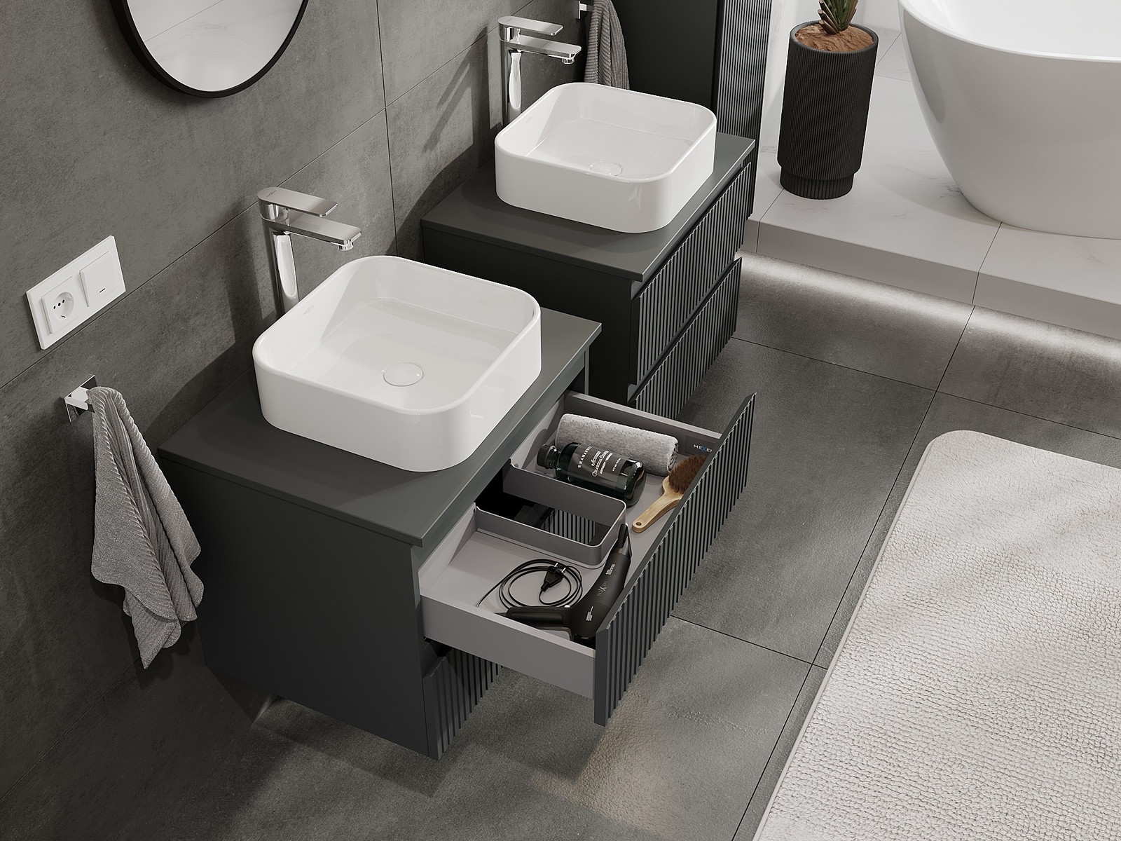 Our modular bathroom furniture can be combined in various colour configurations, allowing for complete personalisation. You can choose both the appearance and functions of individual elements, enabling you to adapt the furniture to your own stylistic and functional preferences.