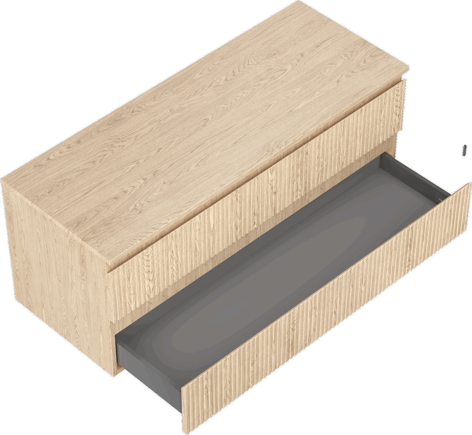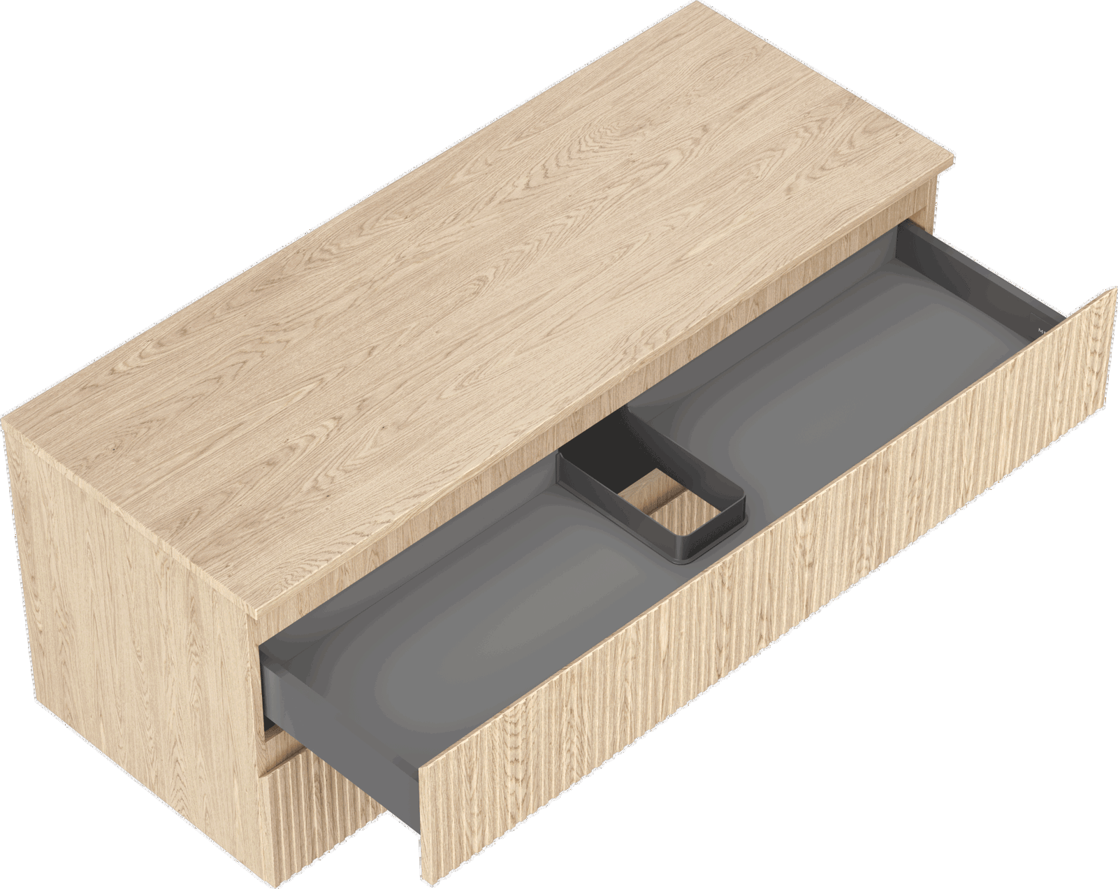 The cutout in the drawer is designed in such a way as to accommodate the siphon, which is essential in sink installations. This allows the furniture to be fully functional without having to give up drawer space for the installation.