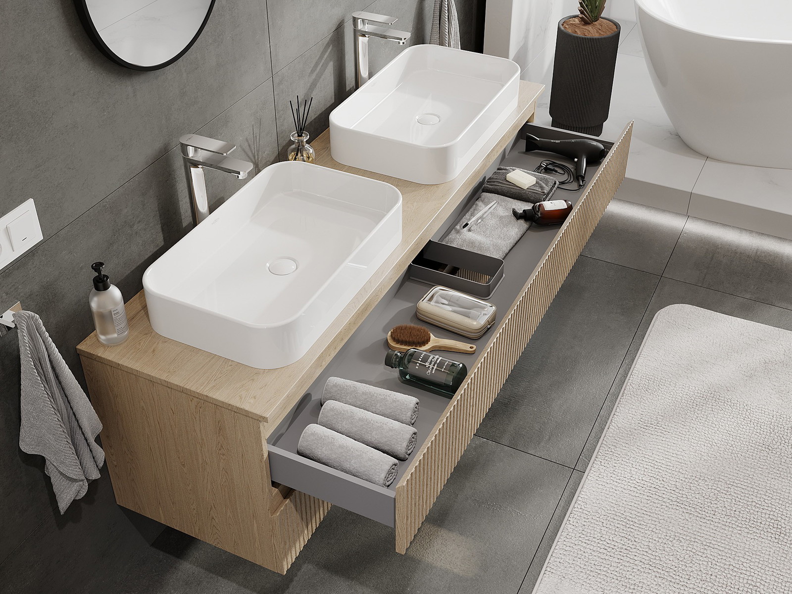 Our modular bathroom furniture can be combined in various colour configurations, allowing for complete personalisation. You can choose both the appearance and functions of individual elements, enabling you to adapt the furniture to your own stylistic and functional preferences.
