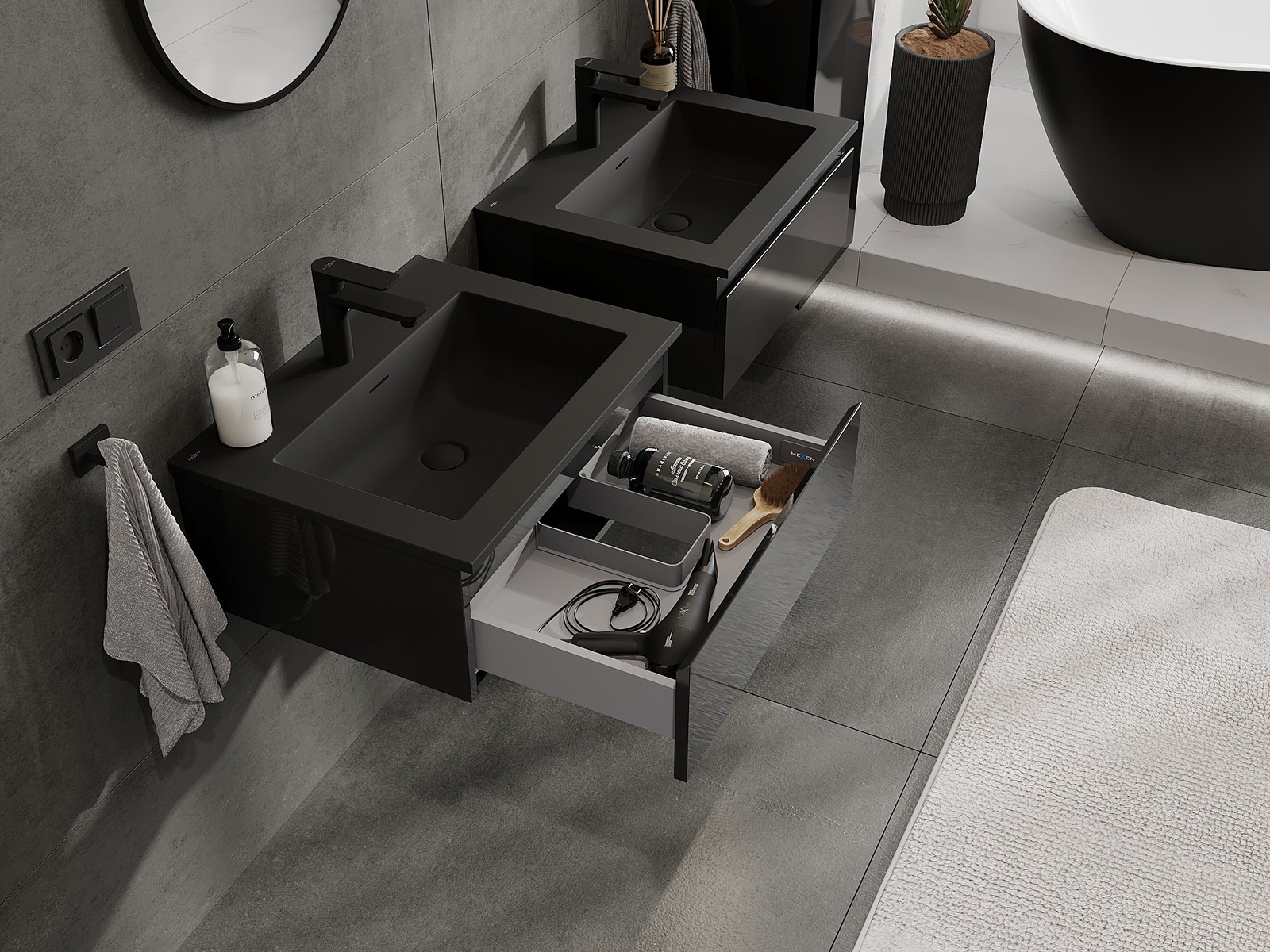Mexen Orio bathroom cabinet 60 cm with Otis washbasin, 1 drawer, black gloss/black matte - 91A10-06023-1-BF70-W18M71