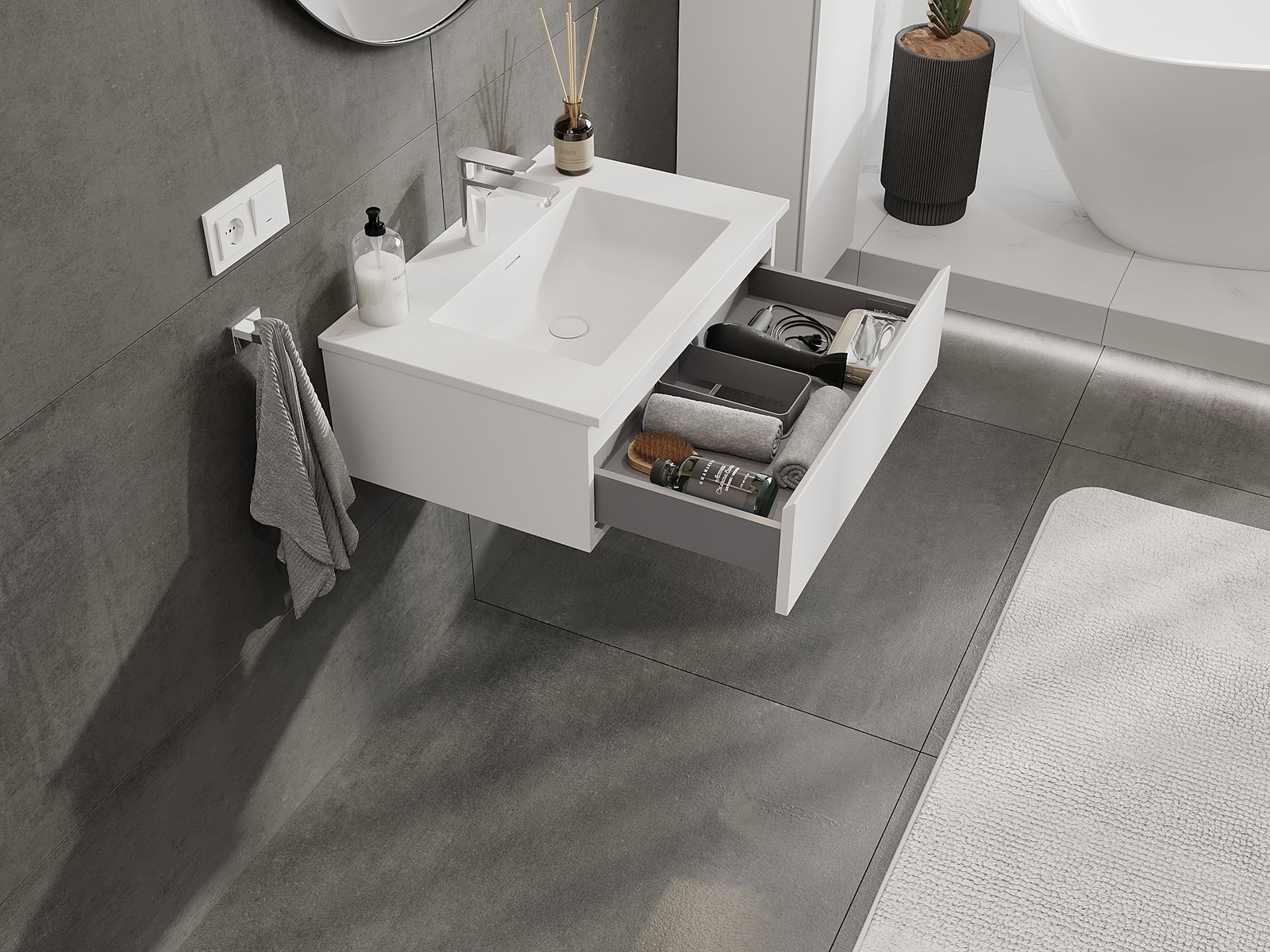 Our modular bathroom furniture can be combined in various colour configurations, allowing for complete personalisation. You can choose both the appearance and functions of individual elements, enabling you to adapt the furniture to your own stylistic and functional preferences.