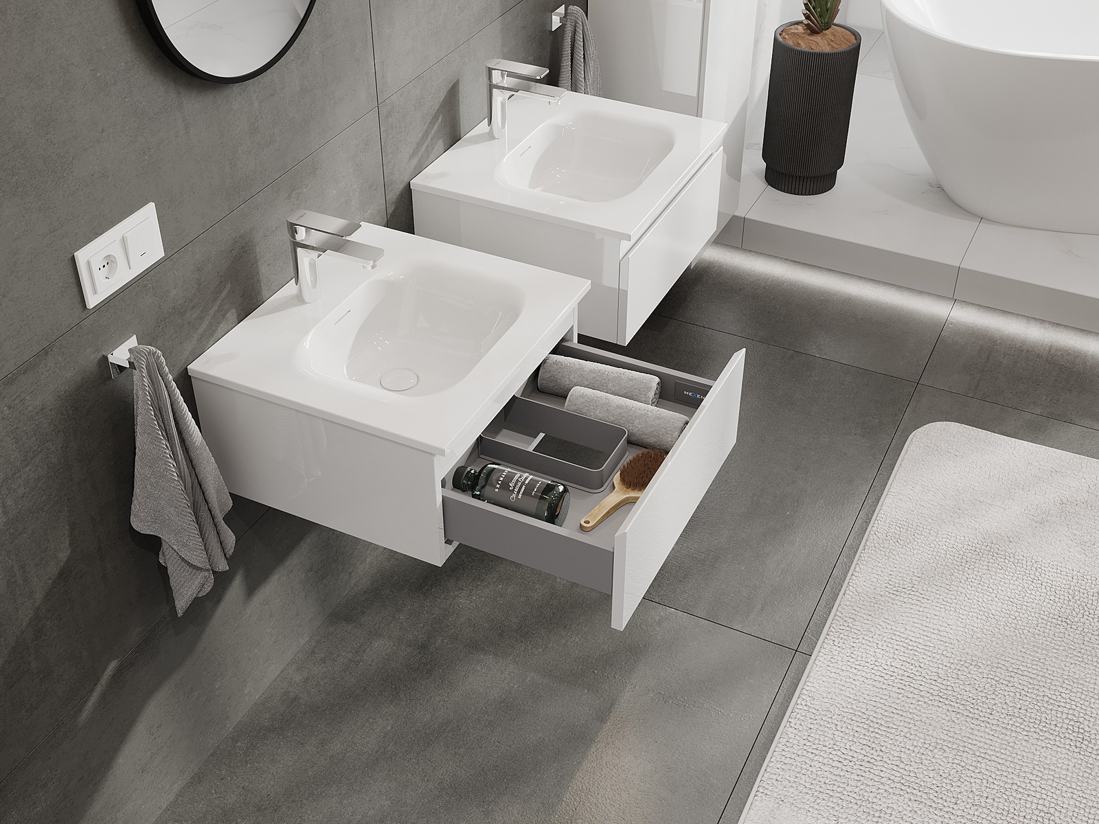 Our modular bathroom furniture can be combined in various colour configurations, allowing for complete personalisation. You can choose both the appearance and functions of individual elements, enabling you to adapt the furniture to your own stylistic and functional preferences.