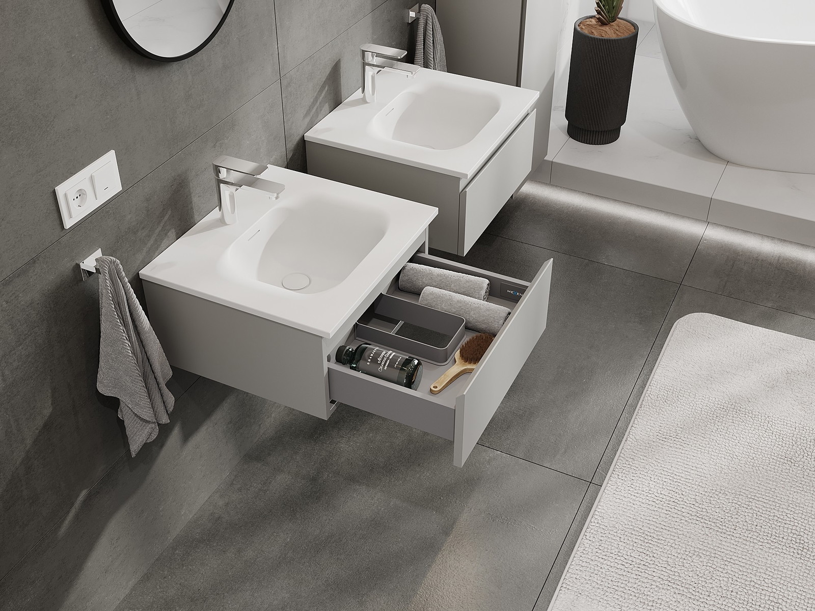 Our modular bathroom furniture can be combined in various colour configurations, allowing for complete personalisation. You can choose both the appearance and functions of individual elements, enabling you to adapt the furniture to your own stylistic and functional preferences.