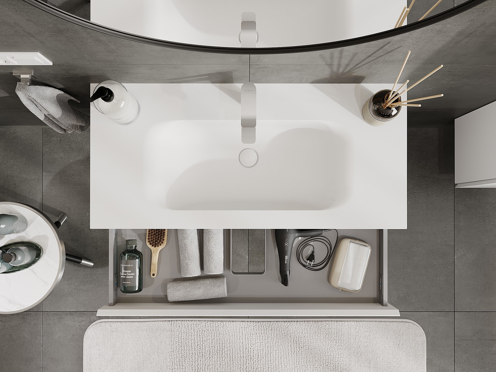 The cutout in the drawer is designed in such a way as to accommodate the siphon, which is essential in sink installations. This allows the furniture to be fully functional without having to give up drawer space for the installation.