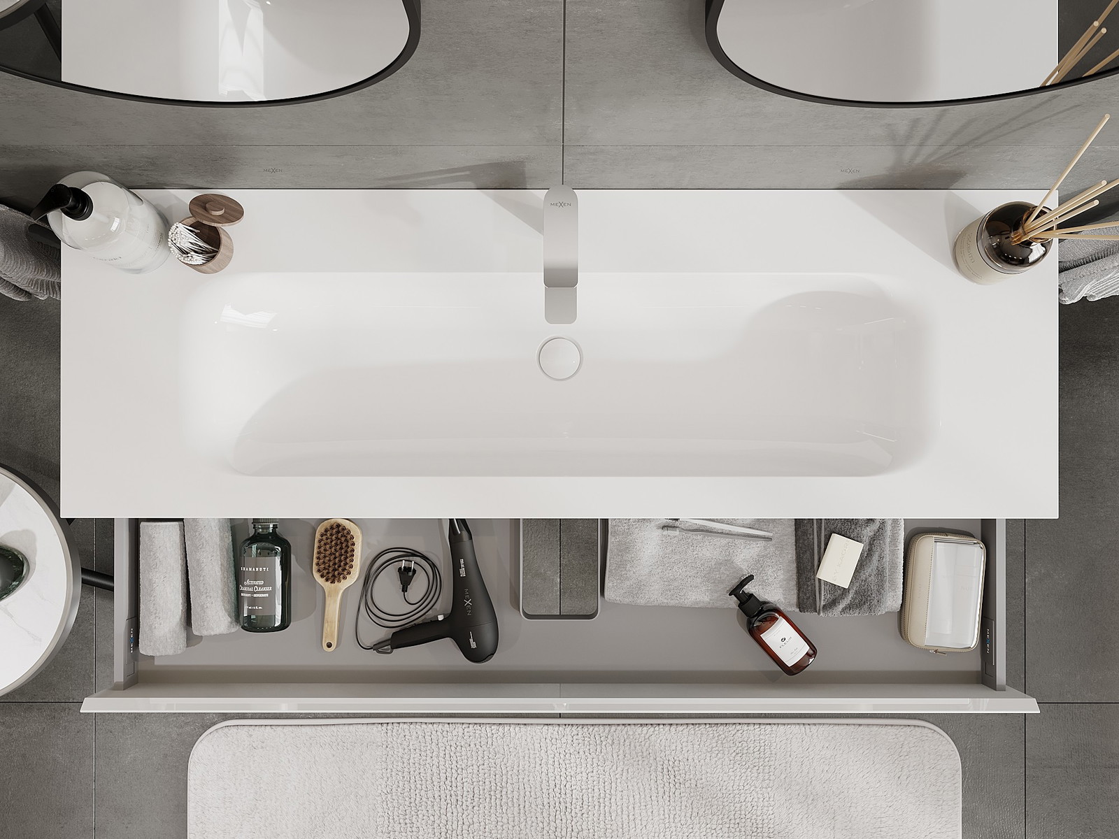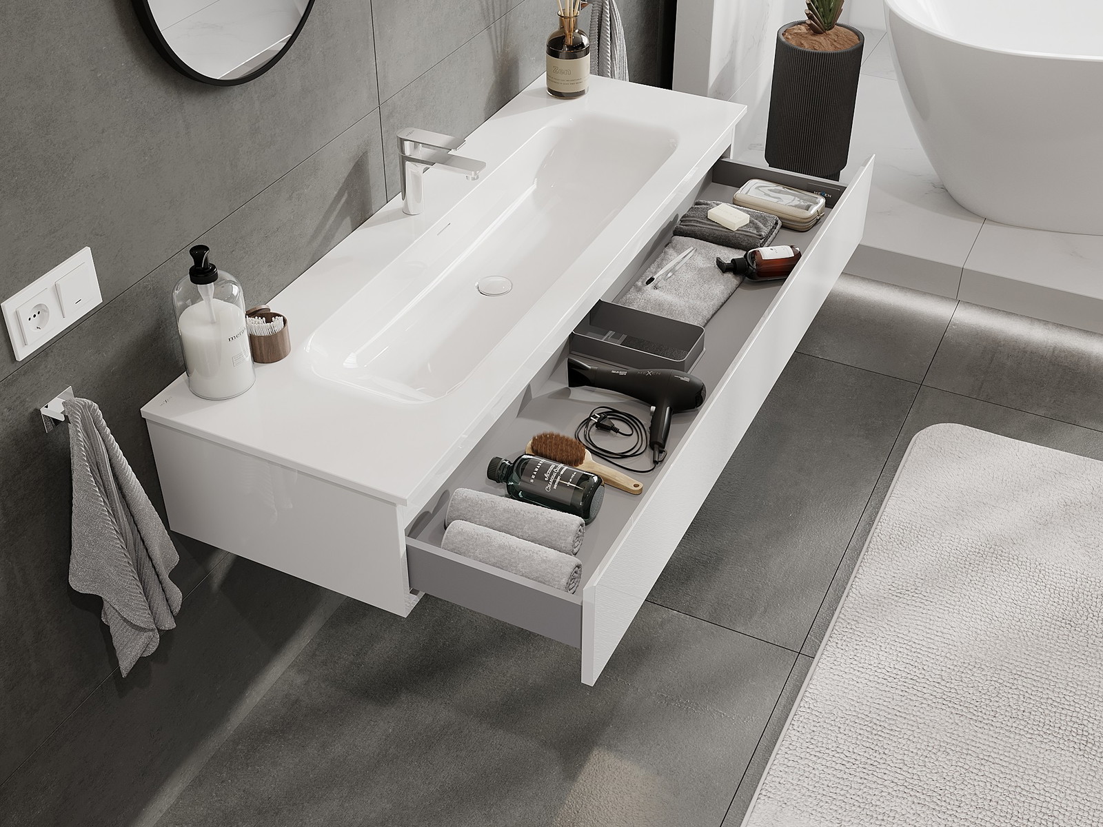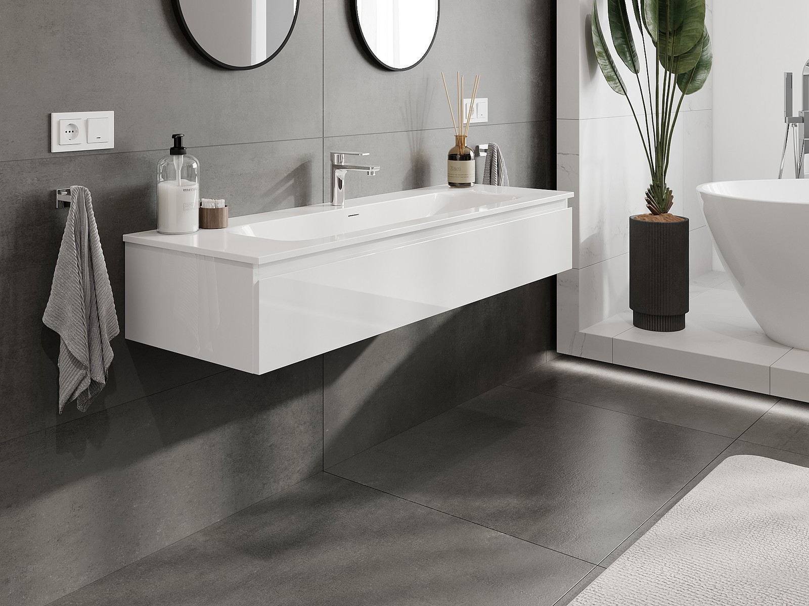 Our modular bathroom furniture can be combined in various colour configurations, allowing for complete personalisation. You can choose both the appearance and functions of individual elements, enabling you to adapt the furniture to your own stylistic and functional preferences.