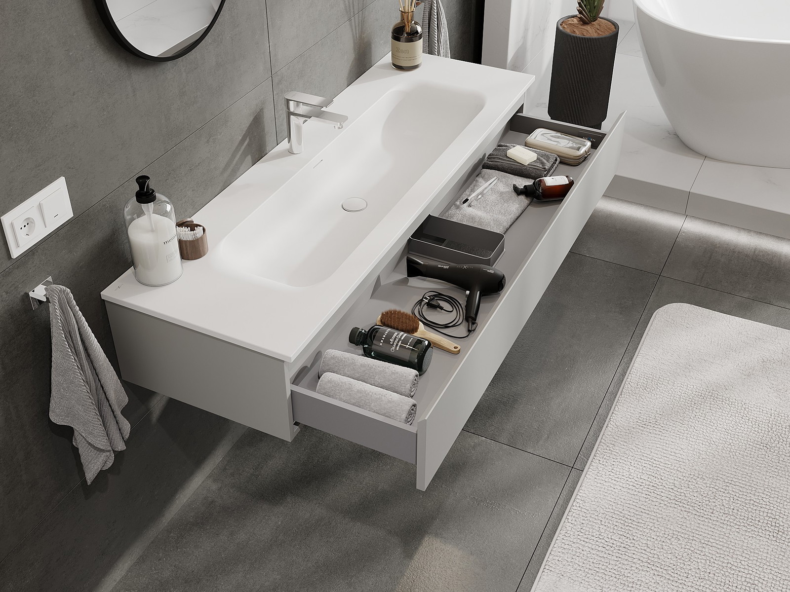 Our modular bathroom furniture can be combined in various colour configurations, allowing for complete personalisation. You can choose both the appearance and functions of individual elements, enabling you to adapt the furniture to your own stylistic and functional preferences.