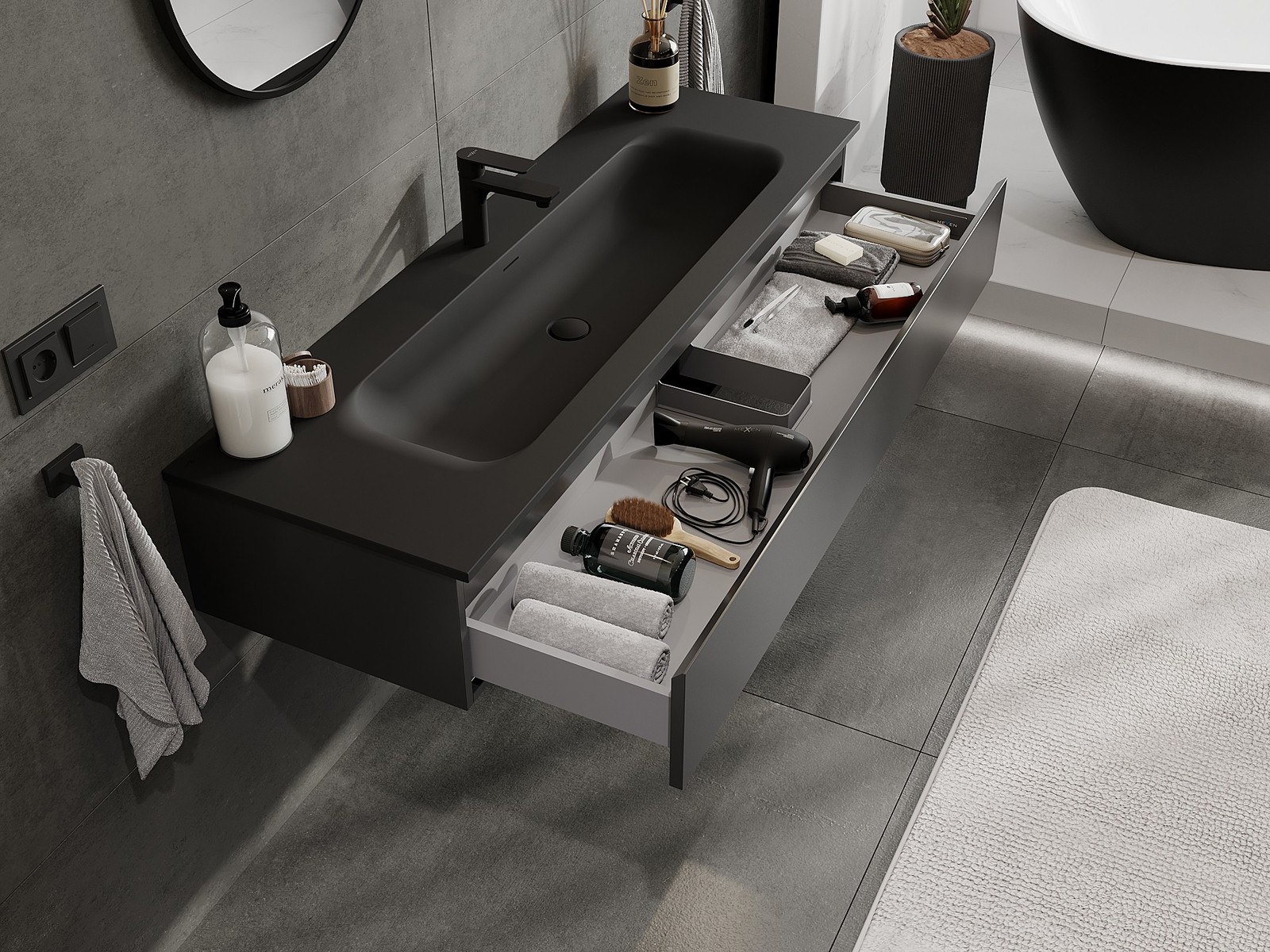 Mexen Orio Bathroom Cabinet 140 cm with Vela Sink, 1 Drawer, Black Matte - 91A10-14023-1-BF71-W23M71