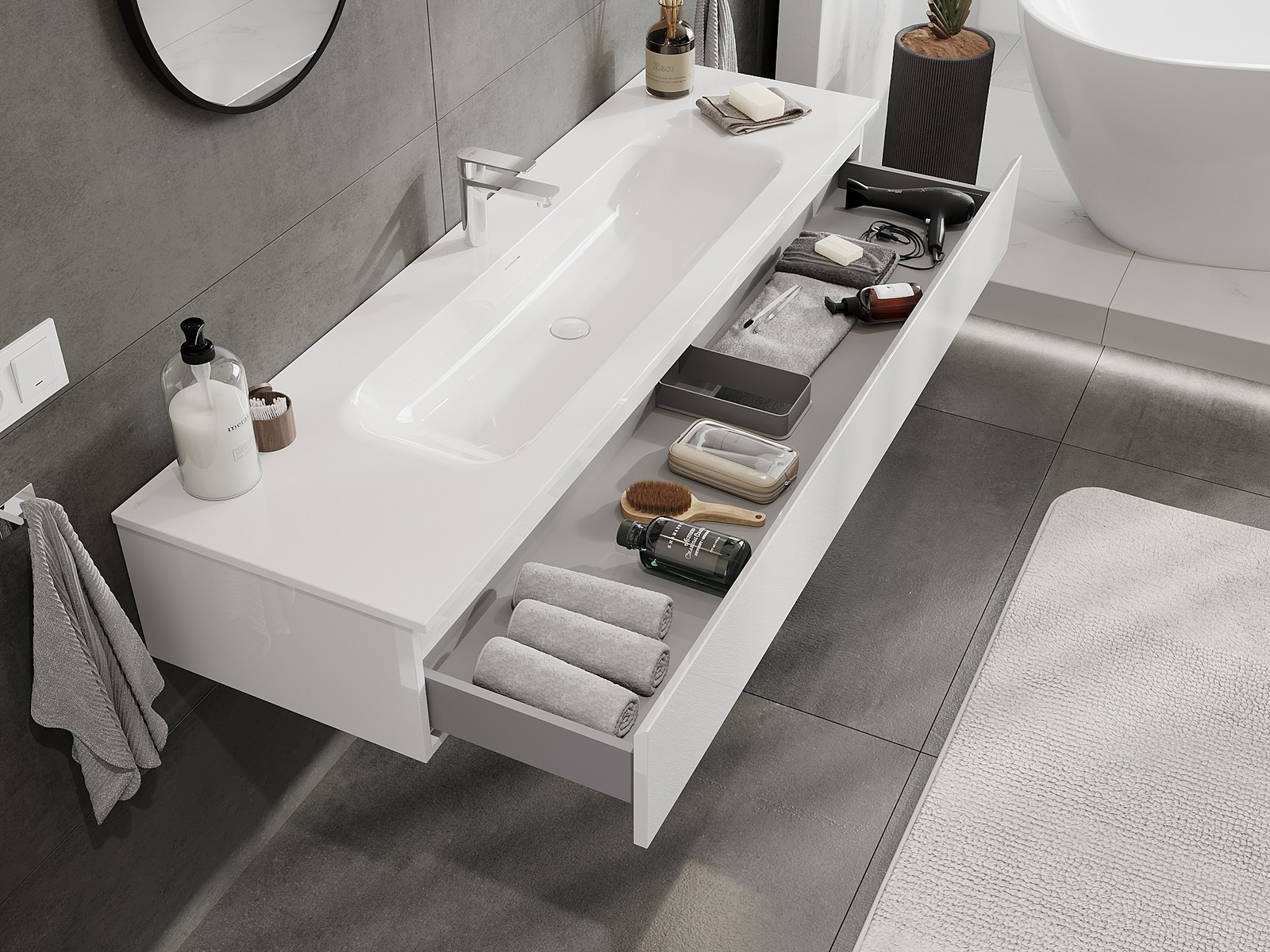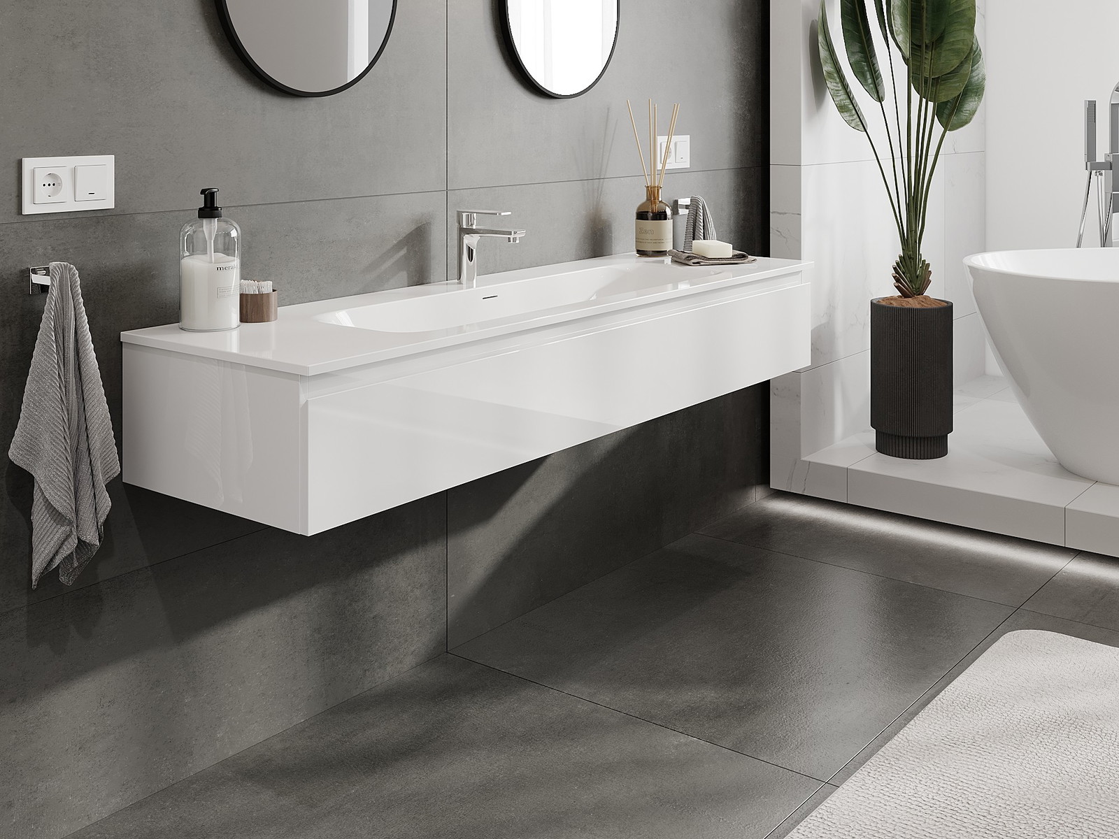 Our modular bathroom furniture can be combined in various colour configurations, allowing for complete personalisation. You can choose both the appearance and functions of individual elements, enabling you to adapt the furniture to your own stylistic and functional preferences.