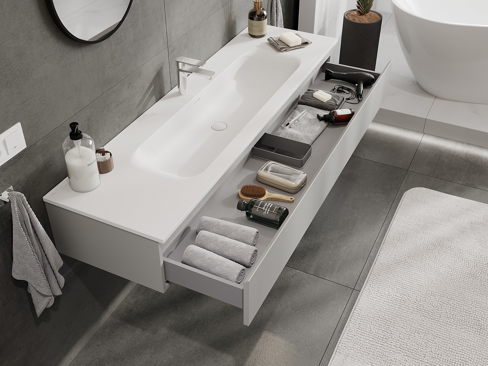 Our modular bathroom furniture can be combined in various colour configurations, allowing for complete personalisation. You can choose both the appearance and functions of individual elements, enabling you to adapt the furniture to your own stylistic and functional preferences.