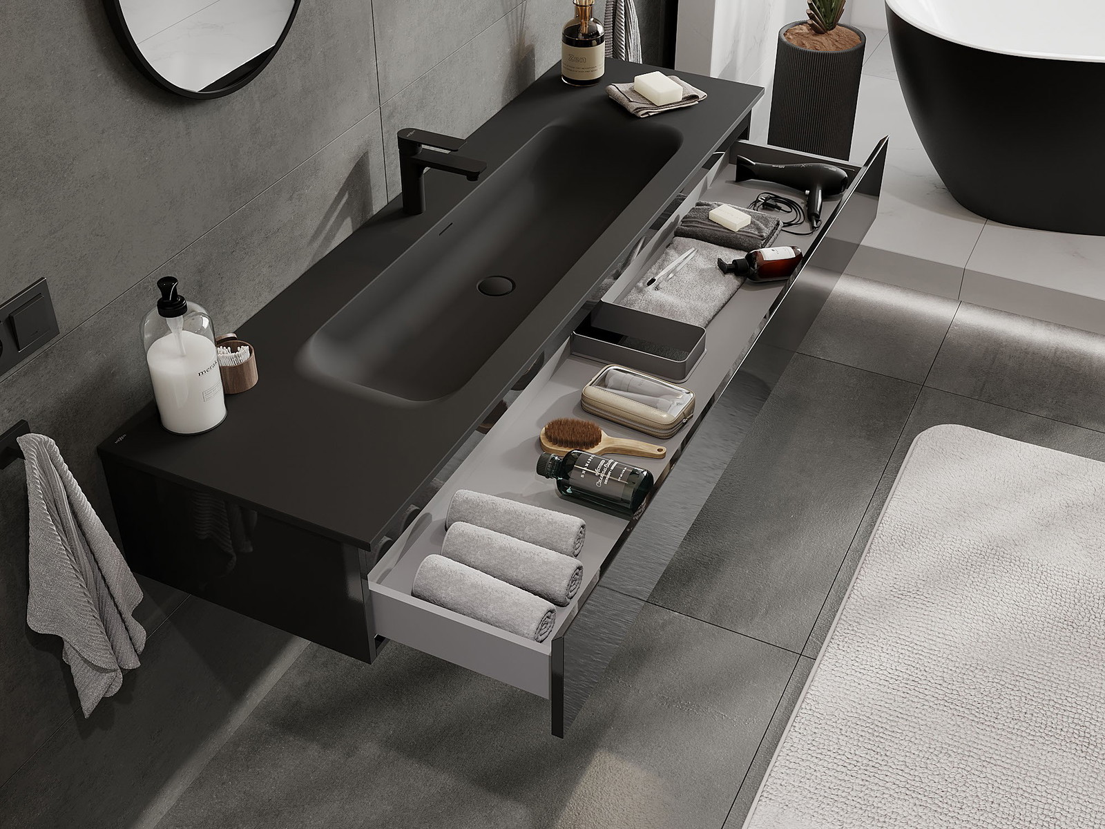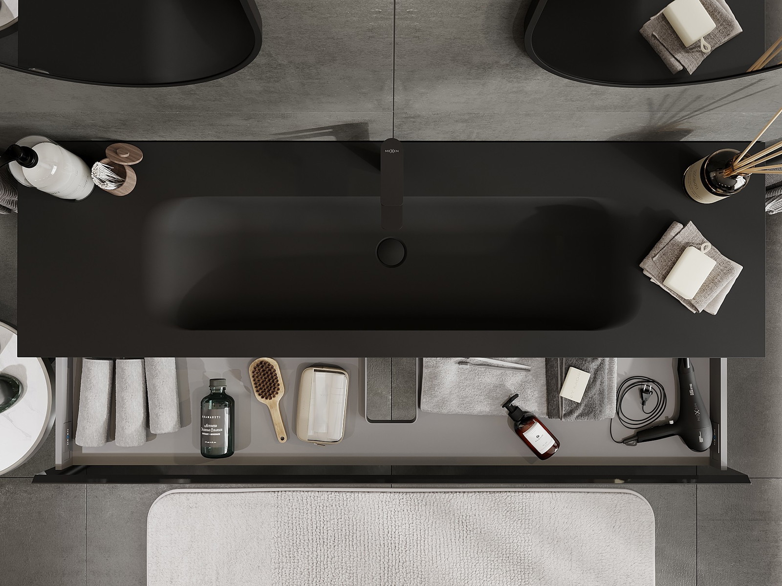 Mexen Orio bathroom cabinet 160 cm with Vela sink, 1 drawer, black gloss/black matte - 91A10-16023-1-BF70-W23M71
