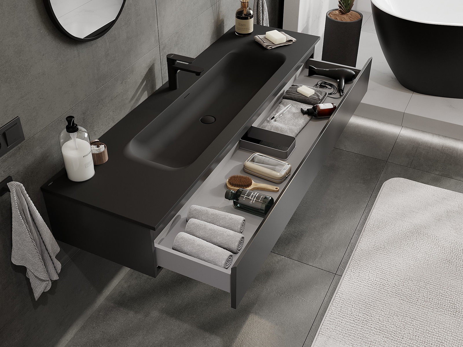 Mexen Orio bathroom cabinet 160 cm with Vela sink, 1 drawer, black matte - 91A10-16023-1-BF71-W23M71