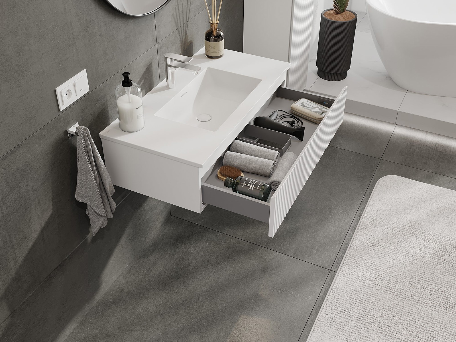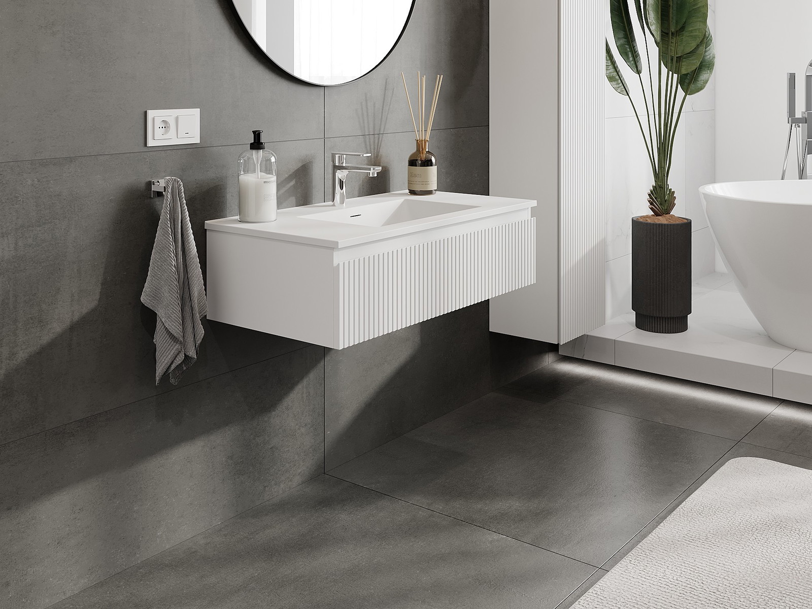 Mexen Rivel 90 cm bathroom cabinet with Otis sink, 1 drawer, grooved, white matt - 91A20-09023-1-BF01-W18M01