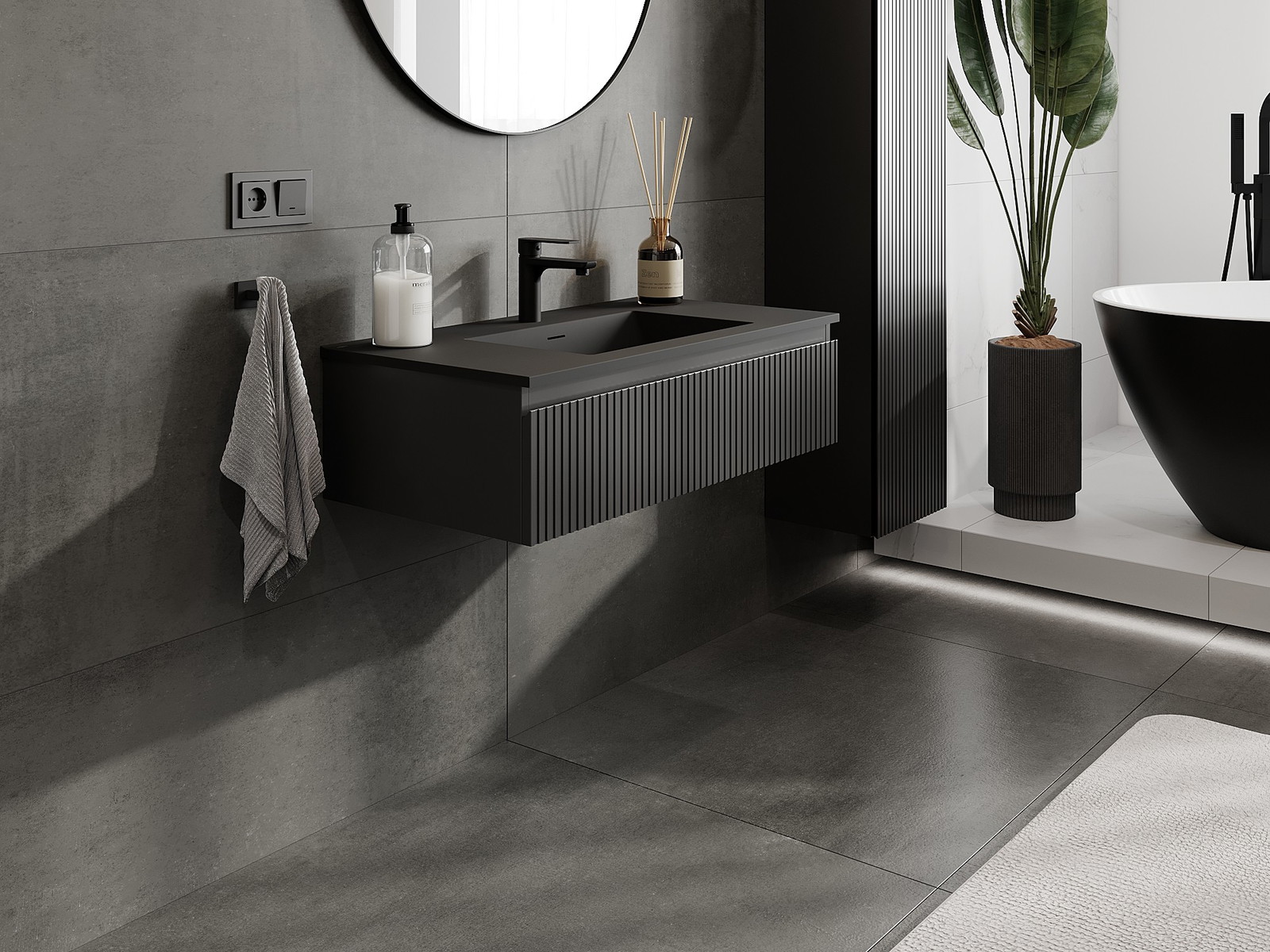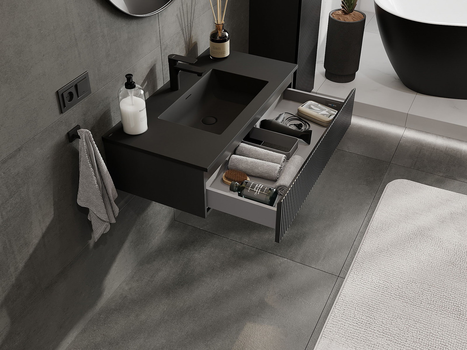 Mexen Rivel bathroom cabinet 90 cm with Otis washbasin, 1 drawer, grooved, black matte - 91A20-09023-1-BF71-W18M71