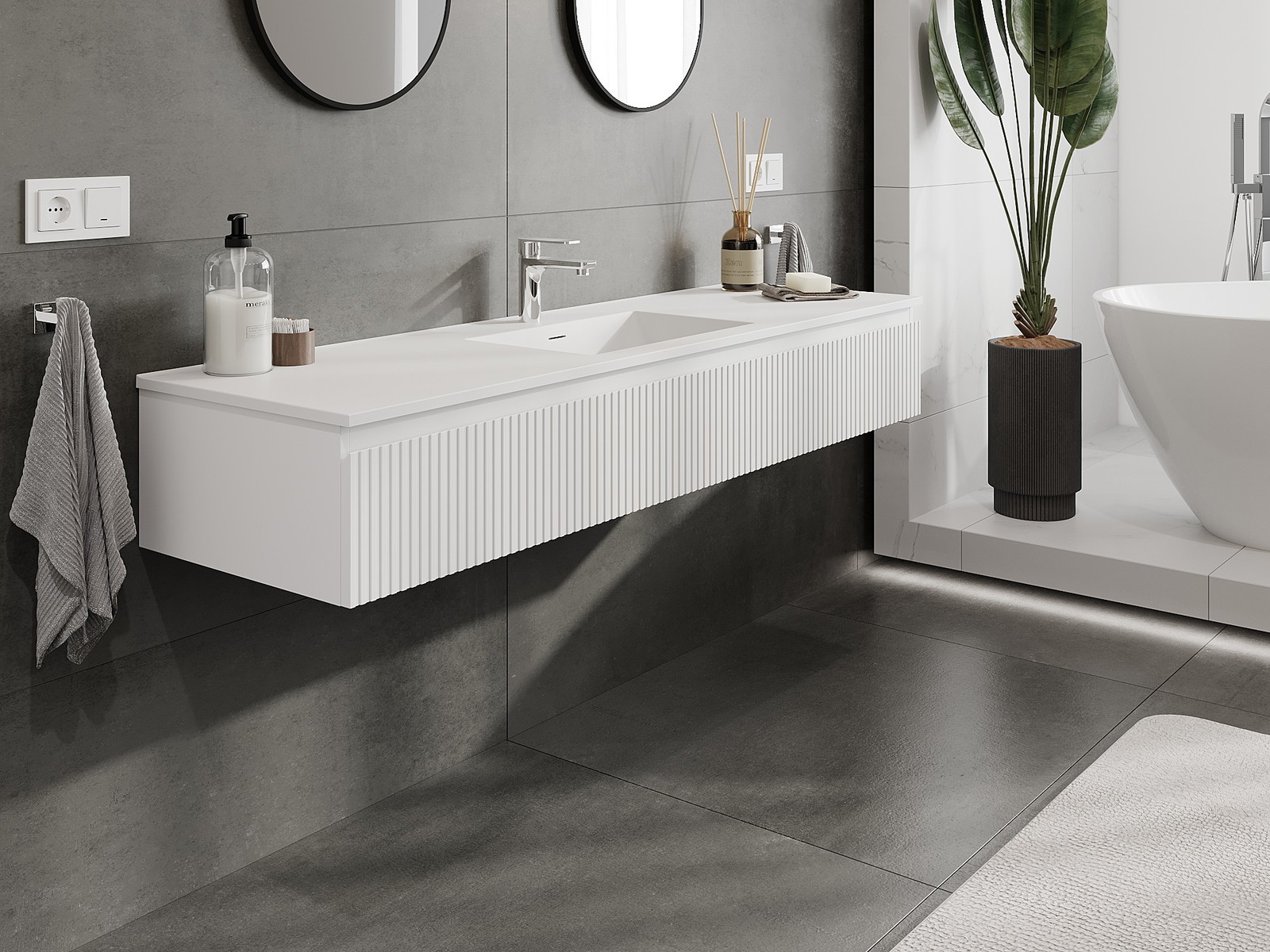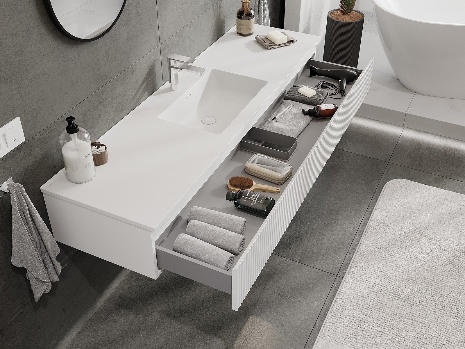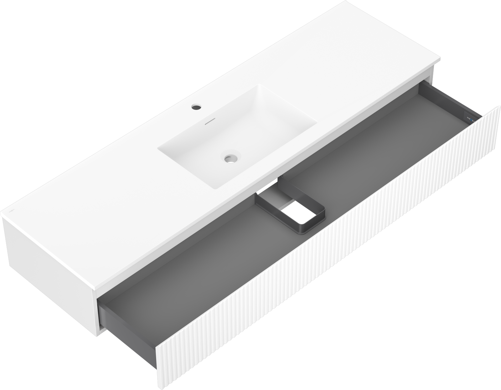 Mexen Rivel 160 cm bathroom cabinet with Otis sink, 1 drawer, fluted, white matt - 91A20-16023-1-BF01-W18M01