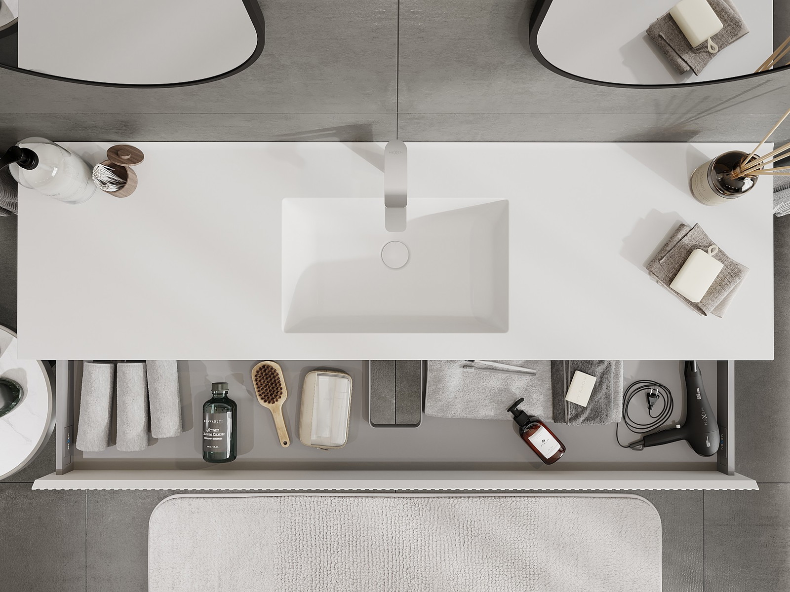 The cutout in the drawer is designed in such a way as to accommodate the siphon, which is essential in sink installations. This allows the furniture to be fully functional without having to give up drawer space for the installation.