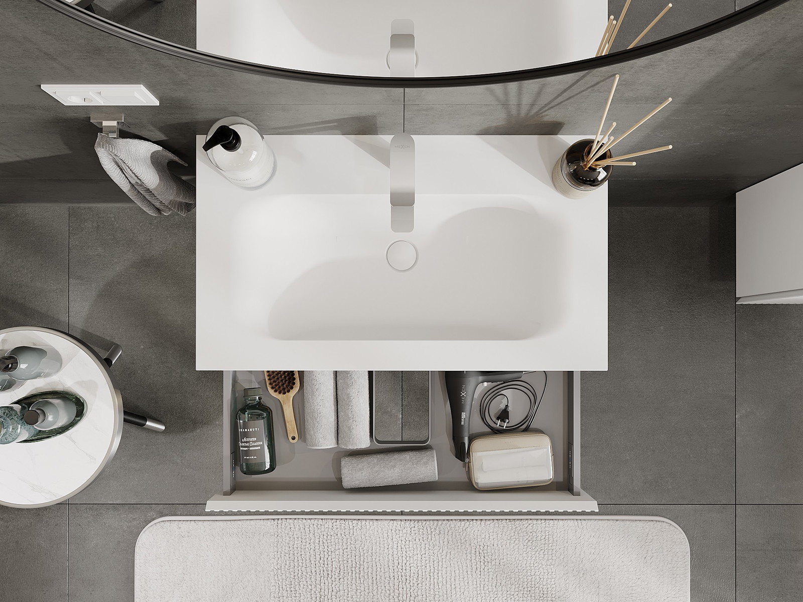 The cutout in the drawer is designed in such a way as to accommodate the siphon, which is essential in sink installations. This allows the furniture to be fully functional without having to give up drawer space for the installation.