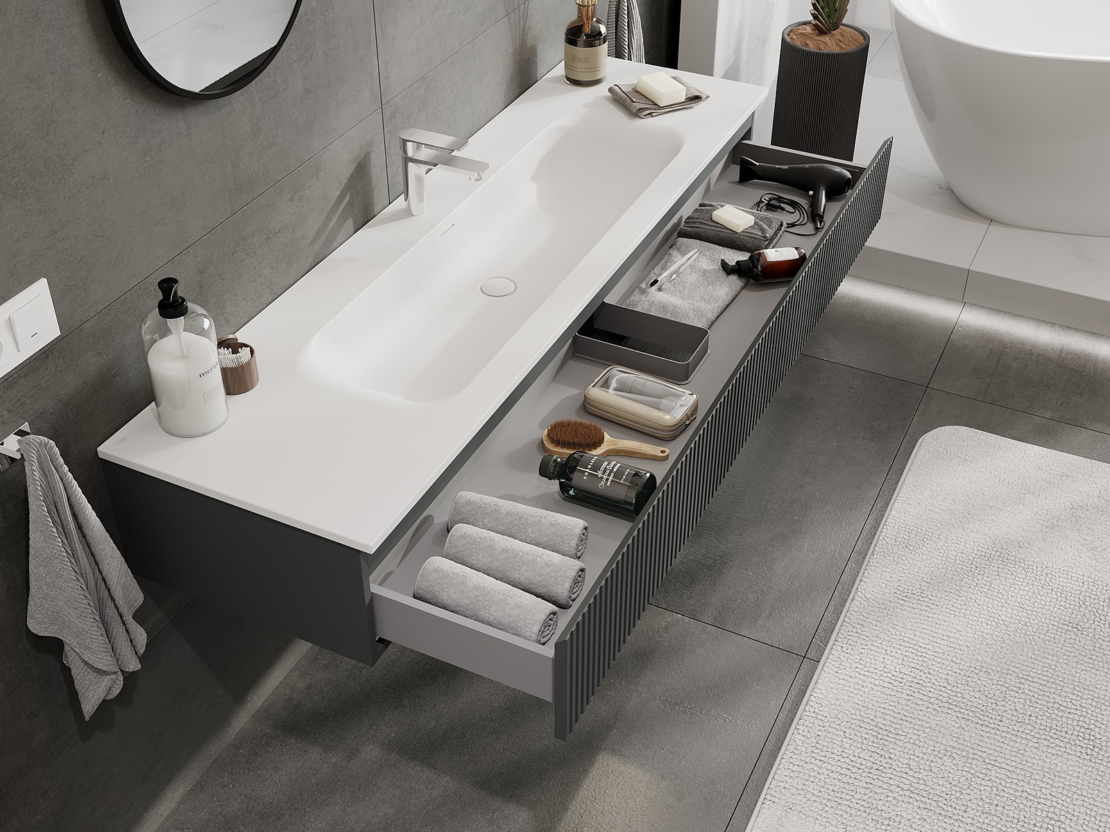 Our modular bathroom furniture can be combined in various colour configurations, allowing for complete personalisation. You can choose both the appearance and functions of individual elements, enabling you to adapt the furniture to your own stylistic and functional preferences.