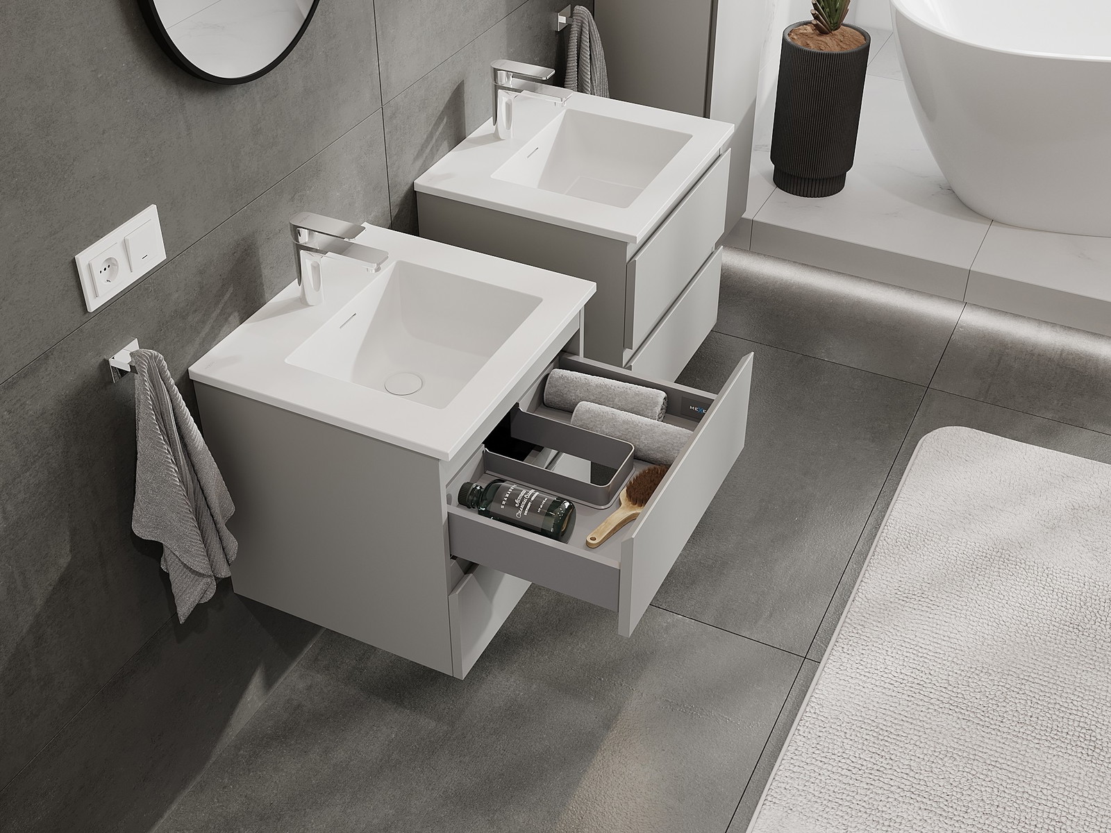 Our modular bathroom furniture can be combined in various colour configurations, allowing for complete personalisation. You can choose both the appearance and functions of individual elements, enabling you to adapt the furniture to your own stylistic and functional preferences.