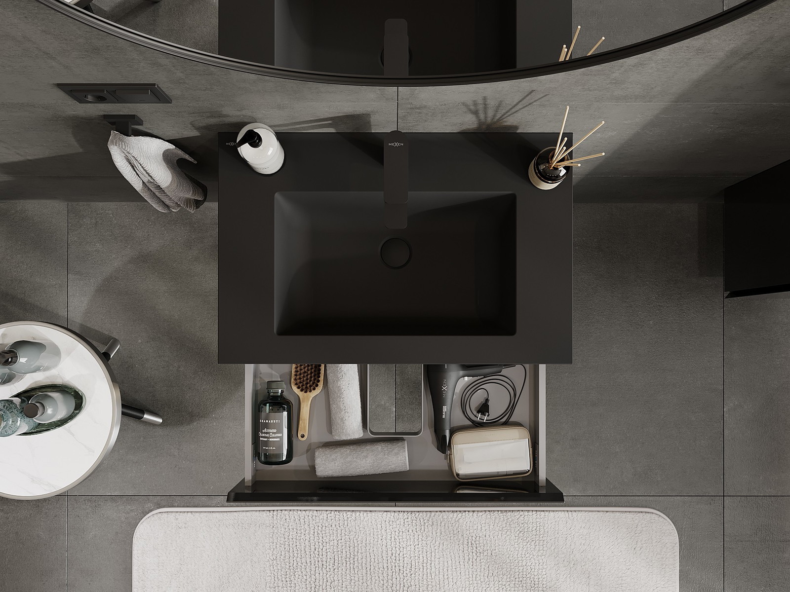 The cutout in the drawer is designed in such a way as to accommodate the siphon, which is essential in sink installations. This allows the furniture to be fully functional without having to give up drawer space for the installation.