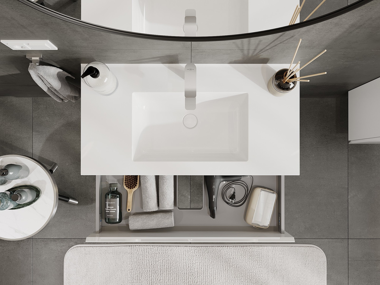 The washbasin has an opening where we can install a tap. This allows for saving valuable space in the bathroom and enhances its aesthetics. This solution also makes it easier to maintain cleanliness around the washbasin.
