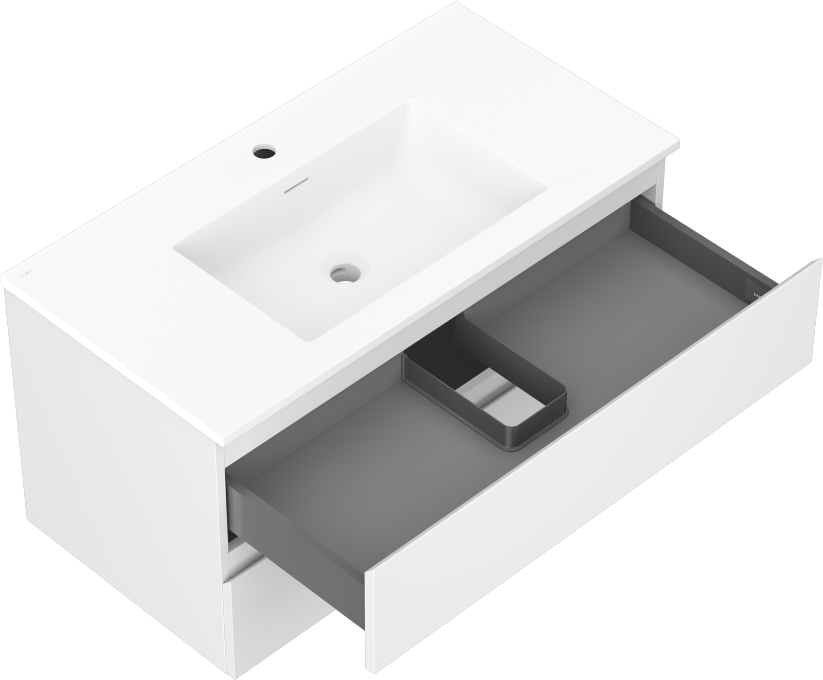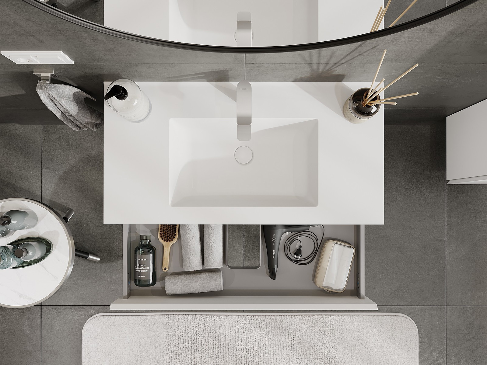 The cutout in the drawer is designed in such a way as to accommodate the siphon, which is essential in sink installations. This allows the furniture to be fully functional without having to give up drawer space for the installation.