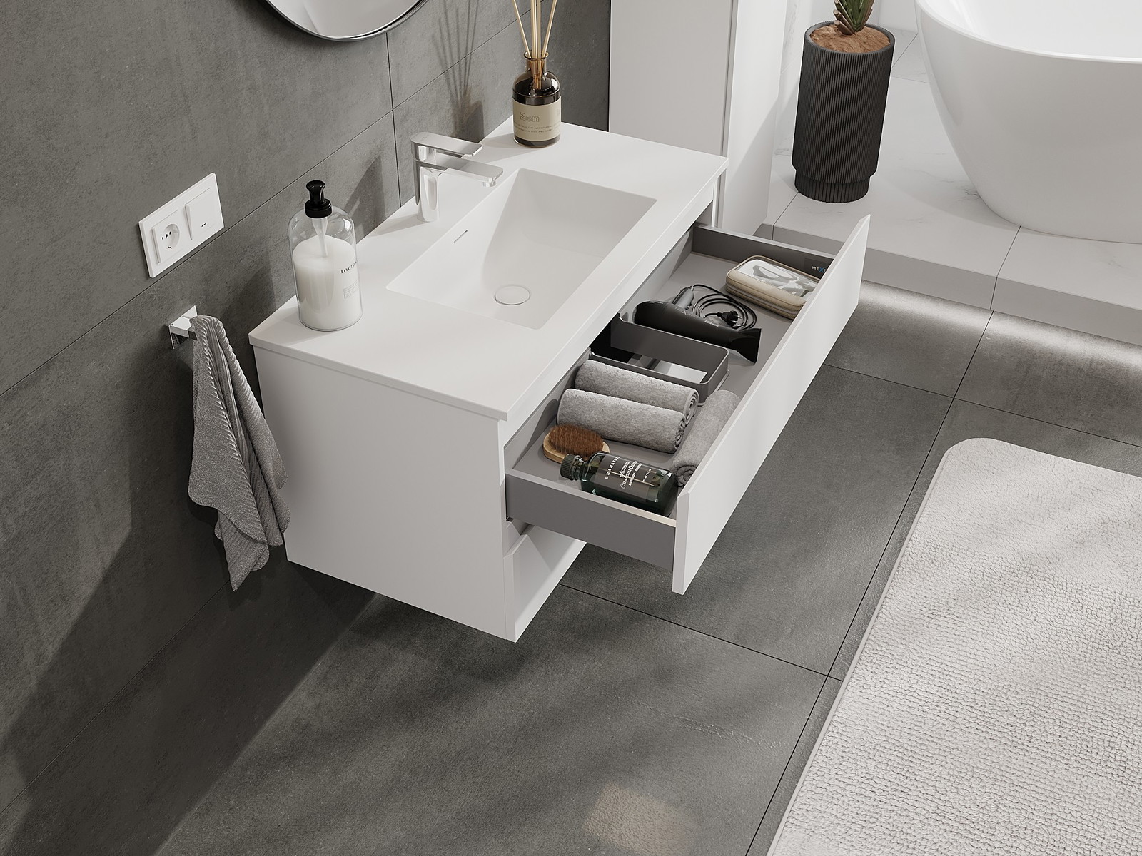 Our modular bathroom furniture can be combined in various colour configurations, allowing for complete personalisation. You can choose both the appearance and functions of individual elements, enabling you to adapt the furniture to your own stylistic and functional preferences.