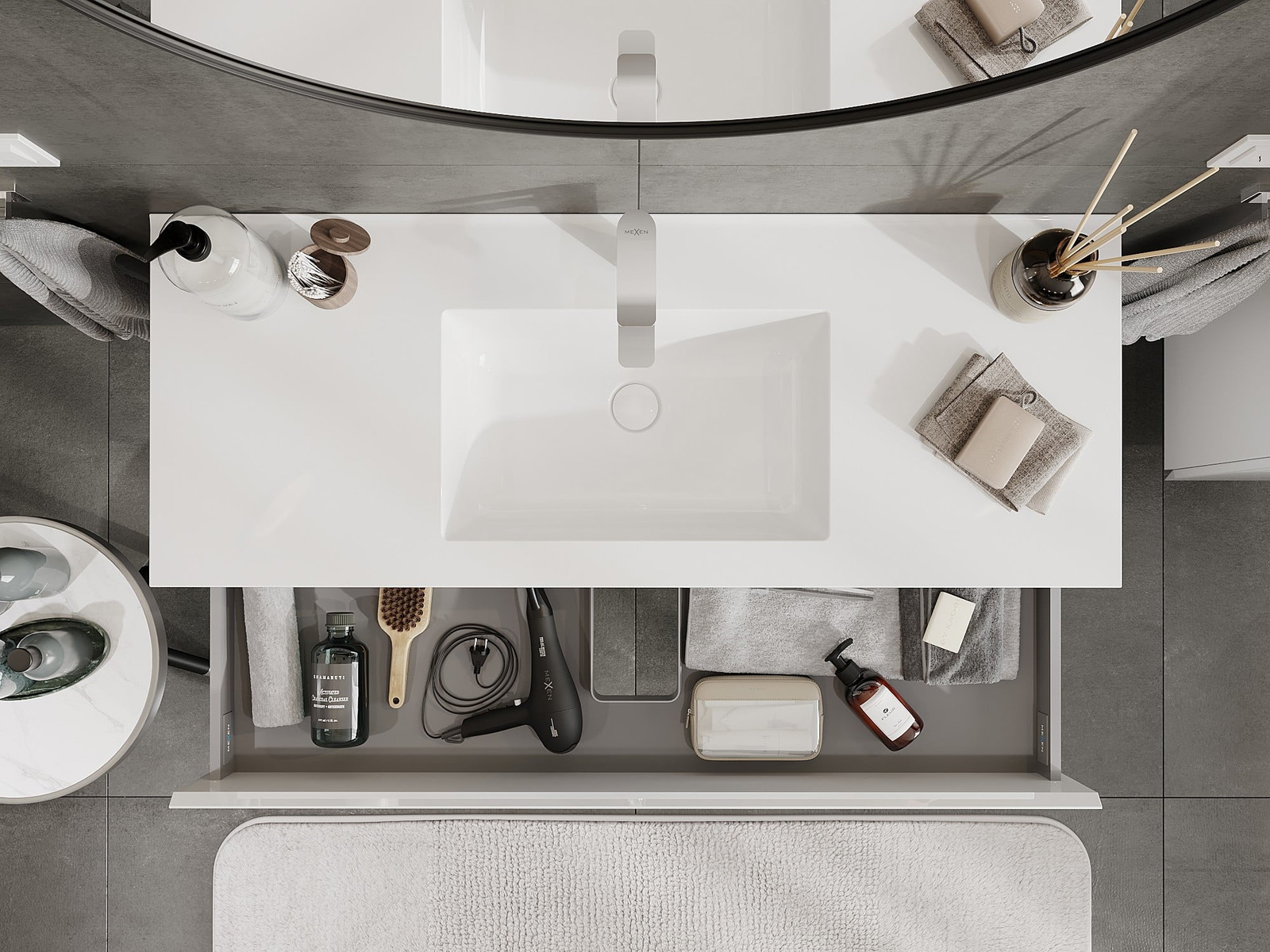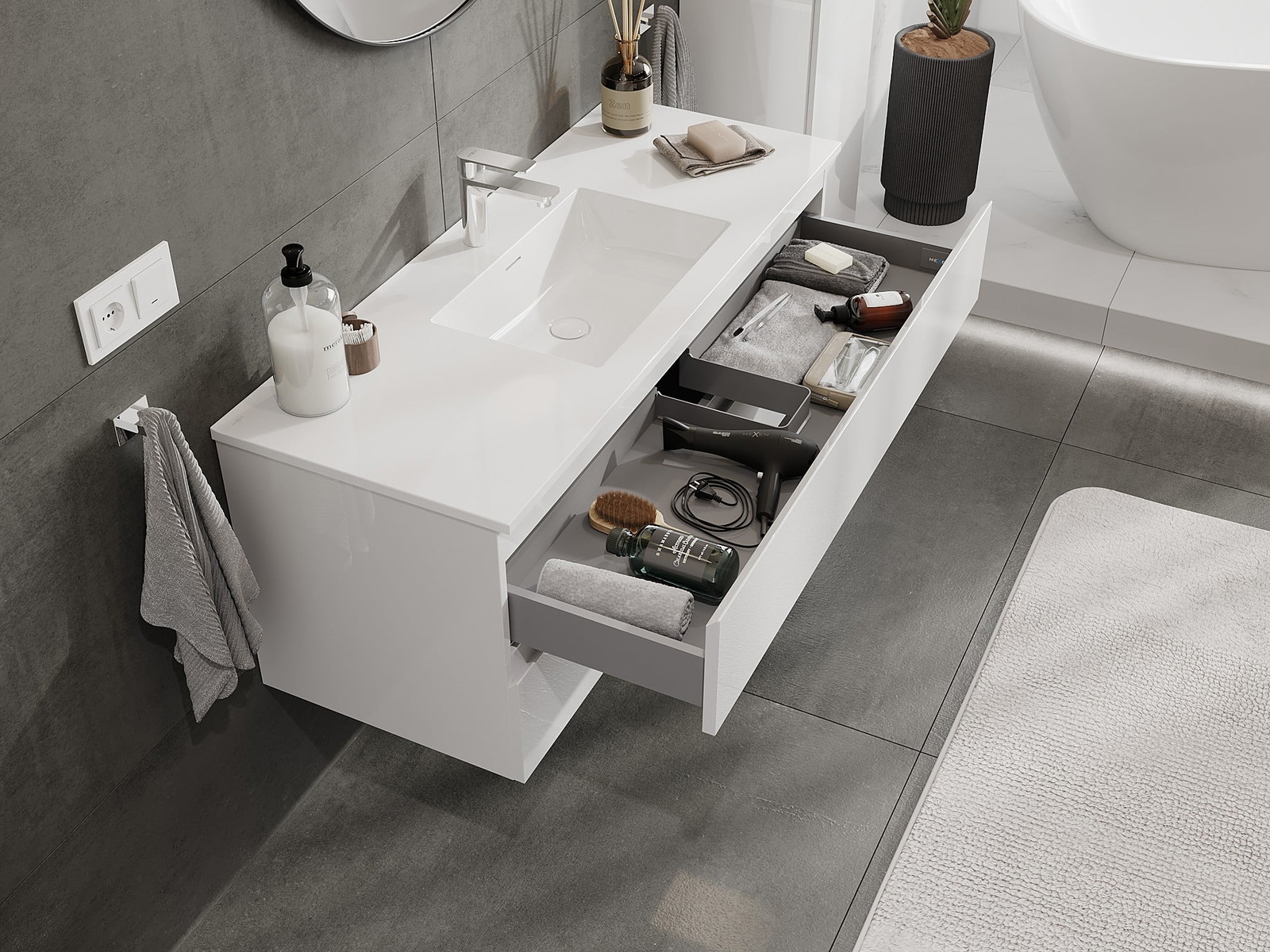 Our modular bathroom furniture can be combined in various colour configurations, allowing for complete personalisation. You can choose both the appearance and functions of individual elements, enabling you to adapt the furniture to your own stylistic and functional preferences.