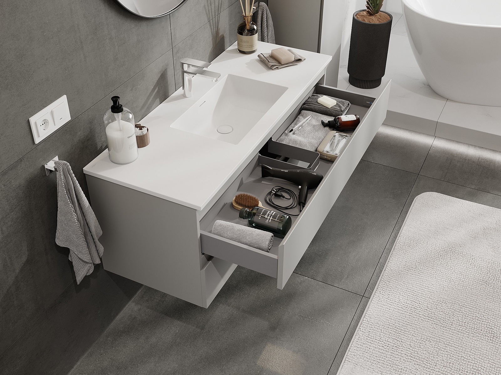 Our modular bathroom furniture can be combined in various colour configurations, allowing for complete personalisation. You can choose both the appearance and functions of individual elements, enabling you to adapt the furniture to your own stylistic and functional preferences.