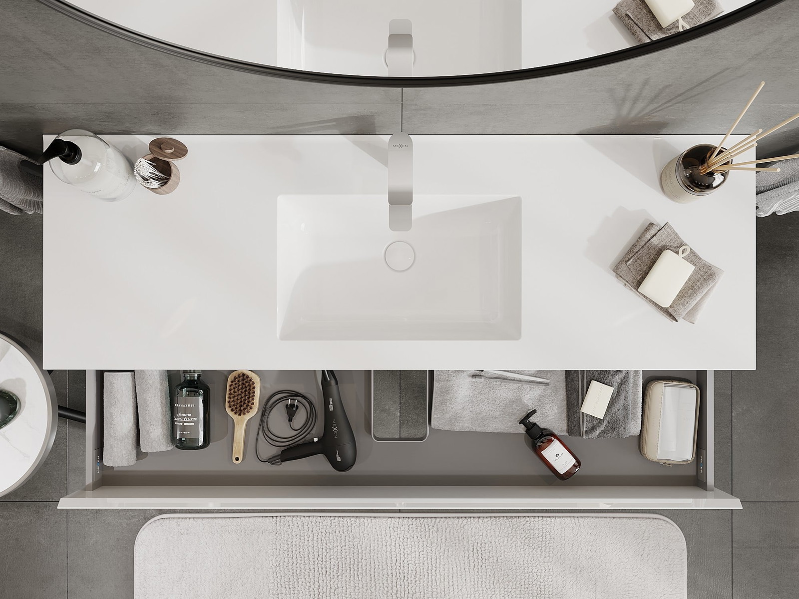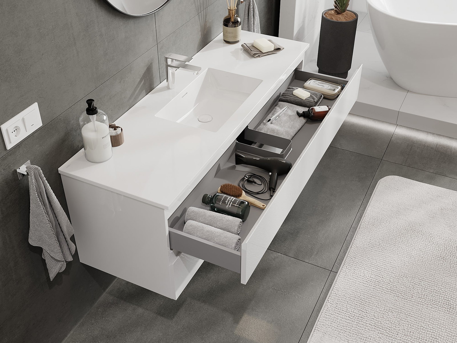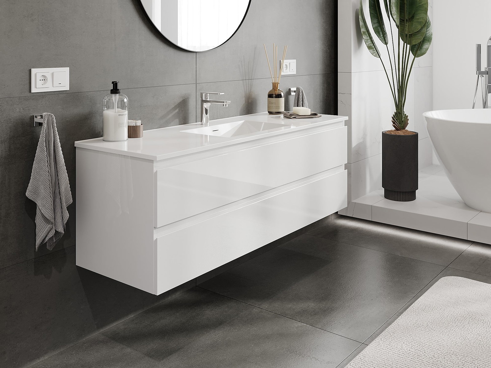 Our modular bathroom furniture can be combined in various colour configurations, allowing for complete personalisation. You can choose both the appearance and functions of individual elements, enabling you to adapt the furniture to your own stylistic and functional preferences.