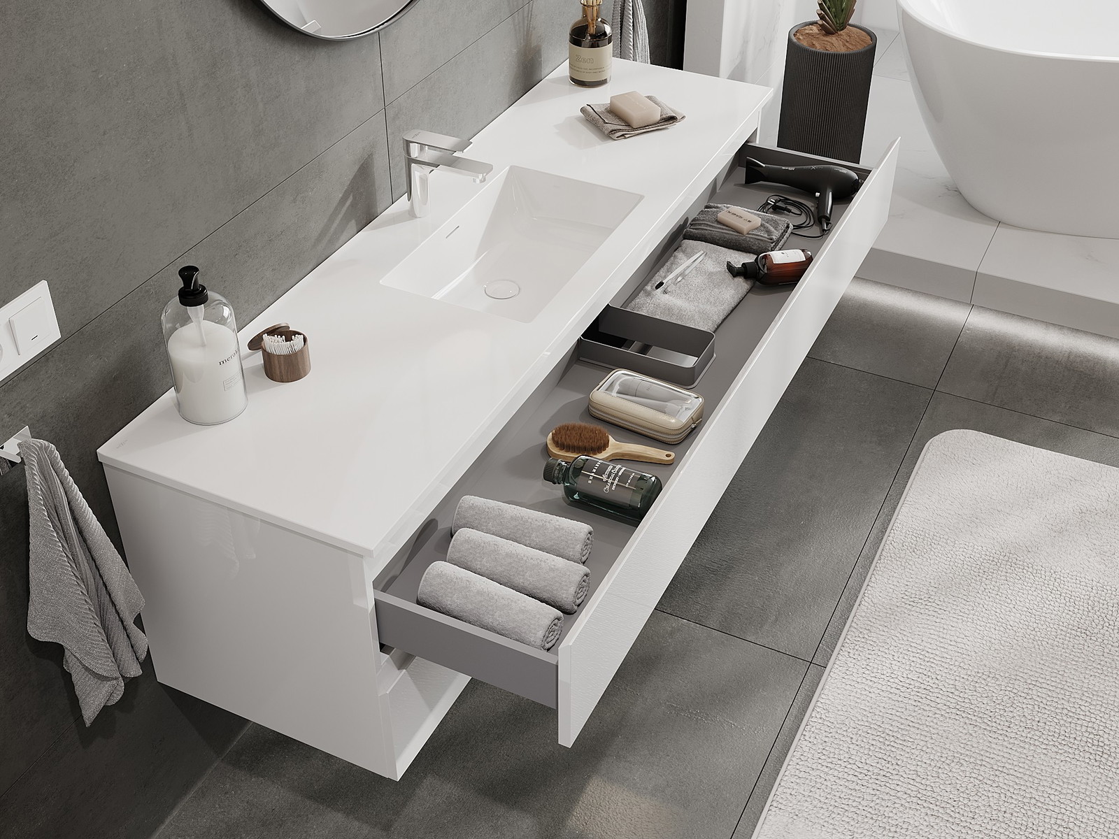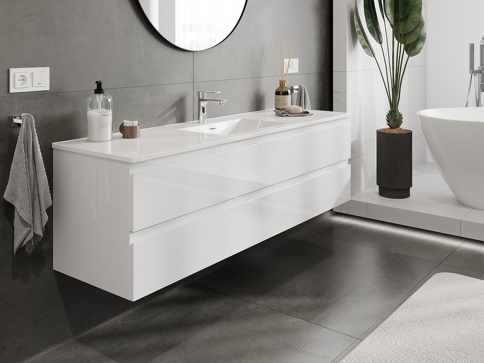 Our modular bathroom furniture can be combined in various colour configurations, allowing for complete personalisation. You can choose both the appearance and functions of individual elements, enabling you to adapt the furniture to your own stylistic and functional preferences.