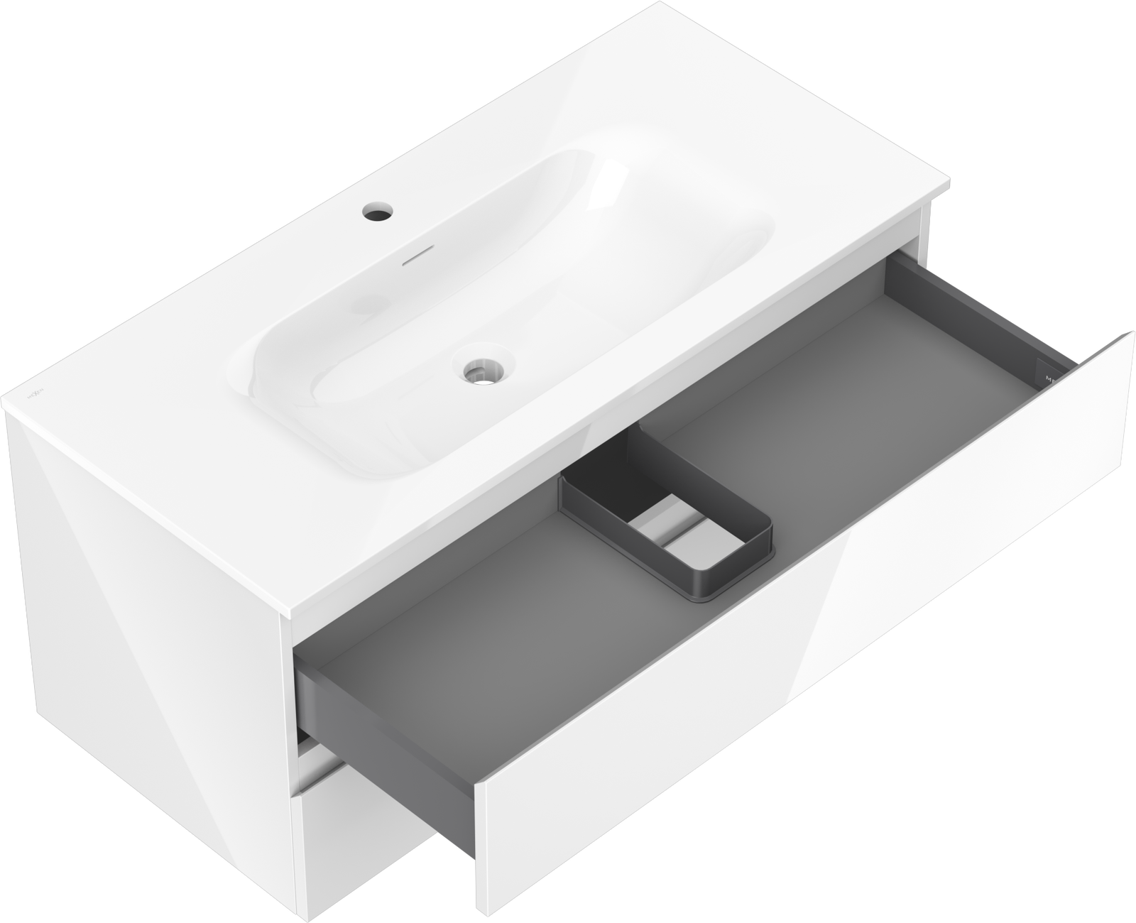 The washbasin has an opening where we can install a tap. This allows for saving valuable space in the bathroom and enhances its aesthetics. This solution also makes it easier to maintain cleanliness around the washbasin.