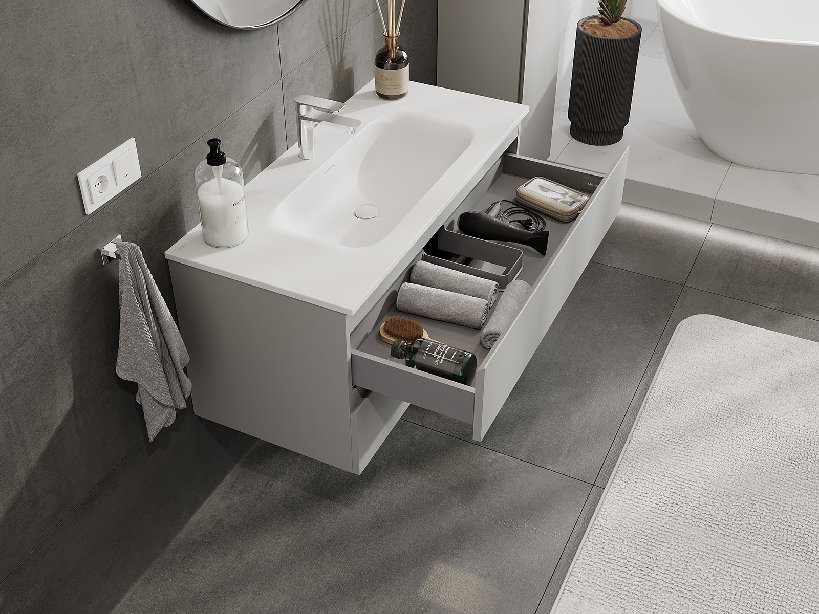 Our modular bathroom furniture can be combined in various colour configurations, allowing for complete personalisation. You can choose both the appearance and functions of individual elements, enabling you to adapt the furniture to your own stylistic and functional preferences.