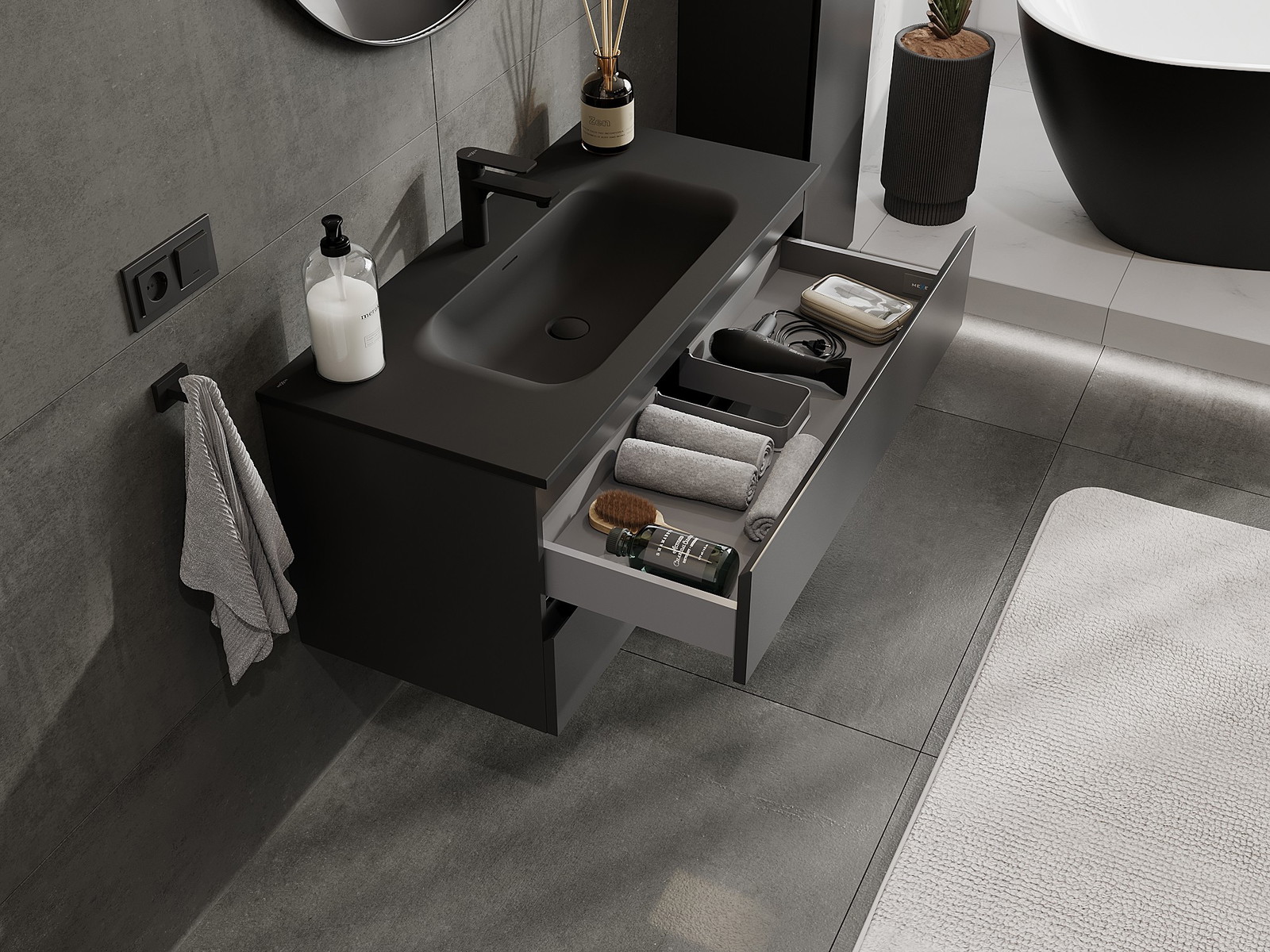 Our modular bathroom furniture can be combined in various colour configurations, allowing for complete personalisation. You can choose both the appearance and functions of individual elements, enabling you to adapt the furniture to your own stylistic and functional preferences.